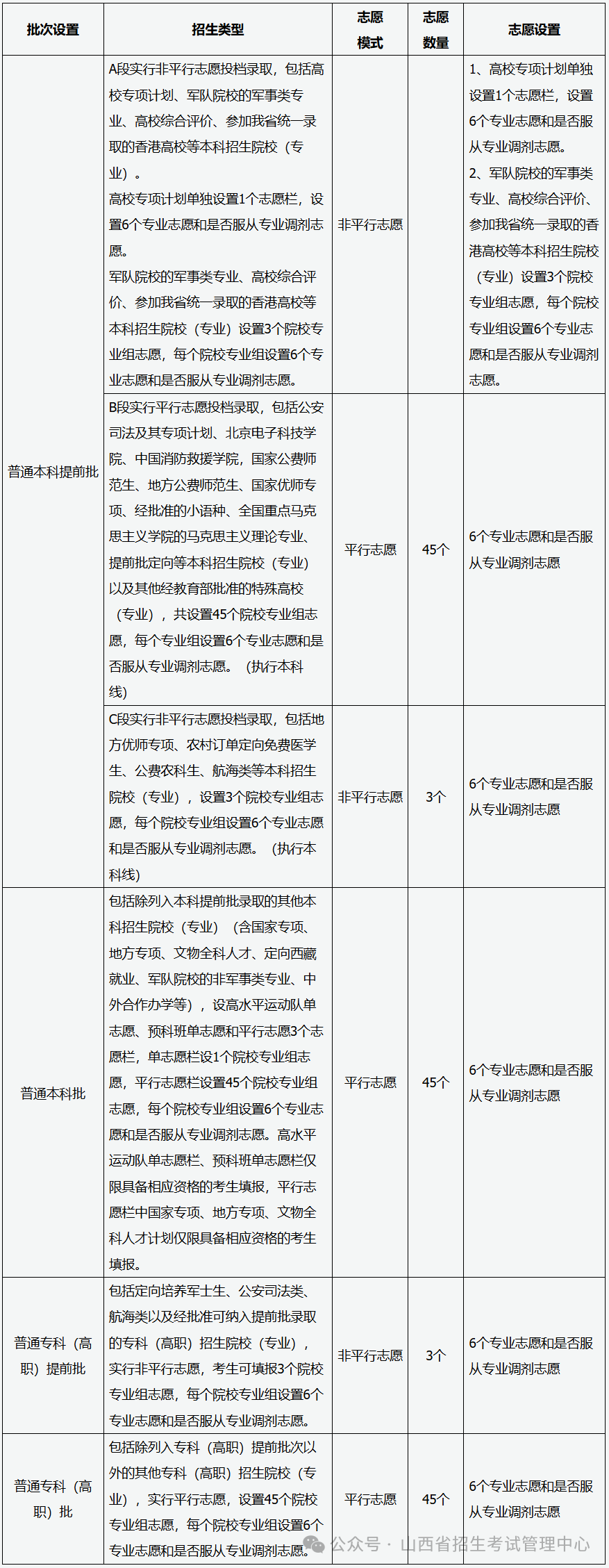 包括除列入专科(高职)提前批次以外的其他专科(高职)招生院校(专业),实行平行志愿,设置45个院校专业组志愿,每个院校专业组设置6个专业志愿和是否服从专业调剂志愿。