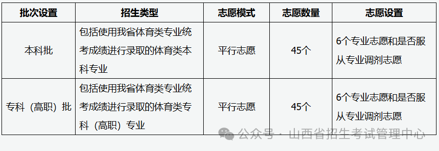 (2)体育专科(高职)批:包括使用我省体育类专业成绩进行录取的体育类专科(高职)专业,实行平行志愿,设置45个院校专业组志愿,每个院校专业组设置6个专业志愿和是否服从专业调剂志愿。