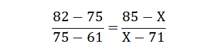 第一步,将该科目所有考生原始分从高到低进行排序,按照规定的等级比例该考生被划定为B等级,该科目B等级原始分区间为61-82(仅是示例,实际各科目各等级原始分区间不固定),即Y1、Y2分别为61和82;