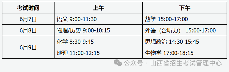 我省2025年高考时间安排在6月7日—9日。其中,全国统一考试科目语文考试时长为150分钟,数学、外语(含听力)考试时长均为120分钟,选考科目每科考试时长均为75分钟。具体考试时间安排见下表。