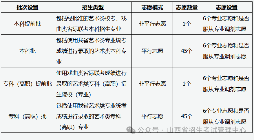 (4)艺术专科(高职)批:包括使用我省艺术类专业省级统考成绩进行录取的艺术类专科(高职)专业,实行平行志愿,设置45个院校专业组志愿,每个院校专业组设置6个专业志愿和是否服从专业调剂志愿。