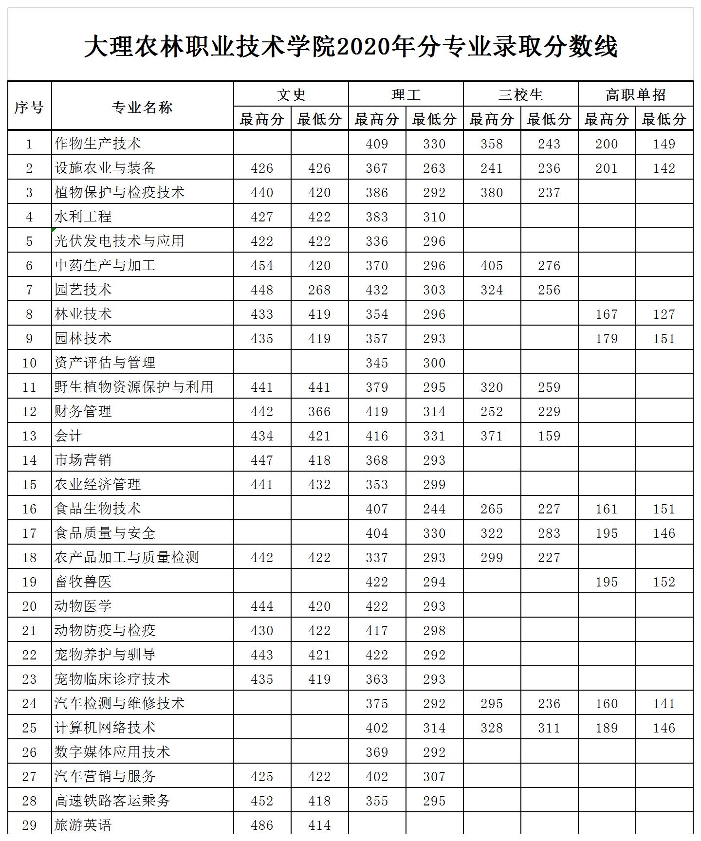 大理农林职业技术学院2020年分专业录取分数线 | |||||||||