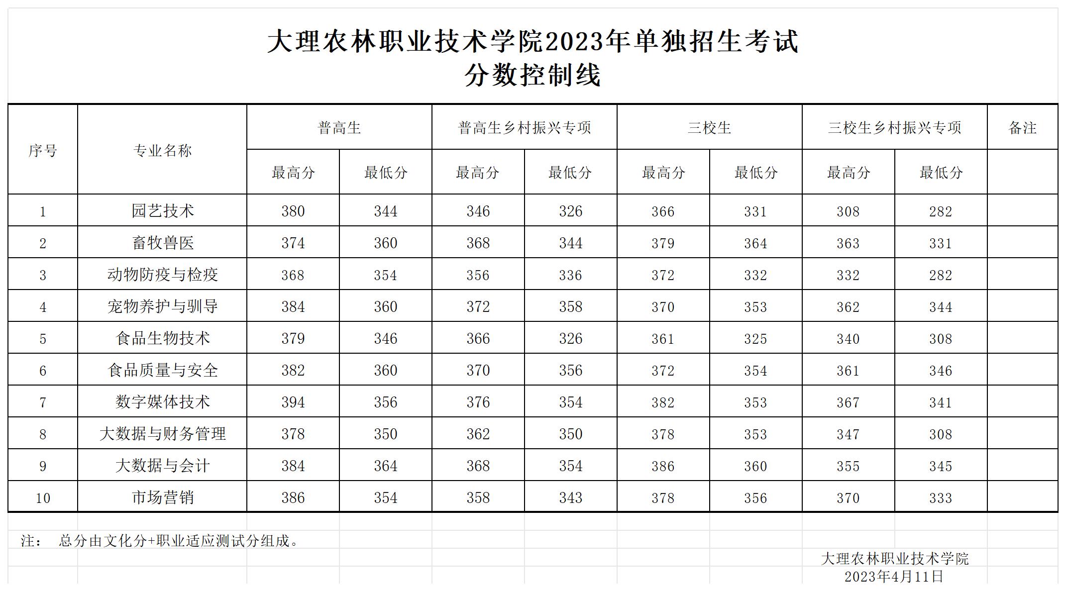 大理农林职业技术学院2023年单独招生录取分数线公示