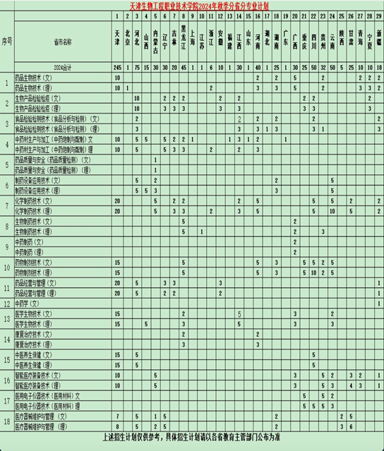 第六条:天津生物工程职业技术学院根据发展规划、办学条件、生源状况和社会需求,制定2024年面向全国多个省、自治区、直辖市的分专业招生计划,同时按照教育部核准下达的具体招生专业、招生人数,在规定时间内上报到各省、自治区、直辖市招生委员会,批准后向社会公布。在招生录取过程中,经学院高职(专科)招生工作领导小组同意,并报上级主管部门批准,对生源好、志愿足、录取分数高的省、自治区、直辖市的招生计划作适当调整。分省分专业招生信息请以各相关省级招办公布的招生计划为准。