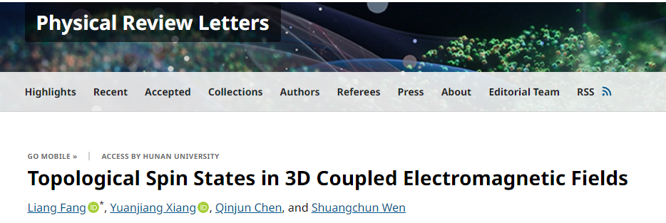 该研究成果以“Topological Spin States in 3D Coupled Electromagnetic Fields”为题在《物理评论快报》(Physical Review Letters)上发表。湖南大学物理与微电子科学学院为论文唯一单位,方良副教授为第一作者兼通讯作者,项元江教授、陈钦俊副教授以及文双春教授为论文合作者。该研究得到了国家自然科学基金、中央高校基本科研业务费等项目资助。