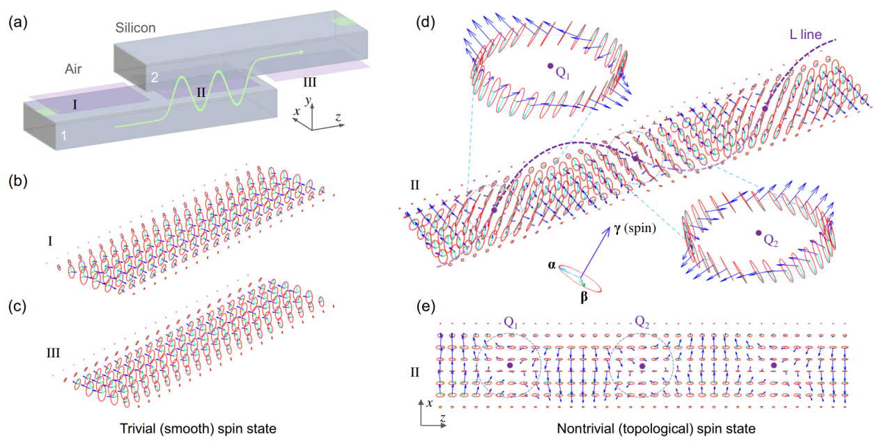 拓扑缺陷在物理学上通常指场分布无法连续形变、物理量无法定义的特殊点,也称为奇点,在涡旋或拓扑结构中普遍存在。拓扑缺陷在宇宙学、流体动力学、空气动力学、声学以及生物学等学科领域也十分常见,并在某些应用中起着重要作用。近年来,探索拓扑结构的电磁类比在光学和光子学中引起了极大兴趣。在集成光子学领域,微纳波导是构建集成光子芯片的基本单元,倏逝场耦合是调控片上光路的重要手段。然而,当波导倏逝场发生耦合时近场自旋会如何演化,一直以来很少有人关注。