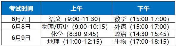 全国统考于6月7日开始举行,具体科目考试时间安排为: