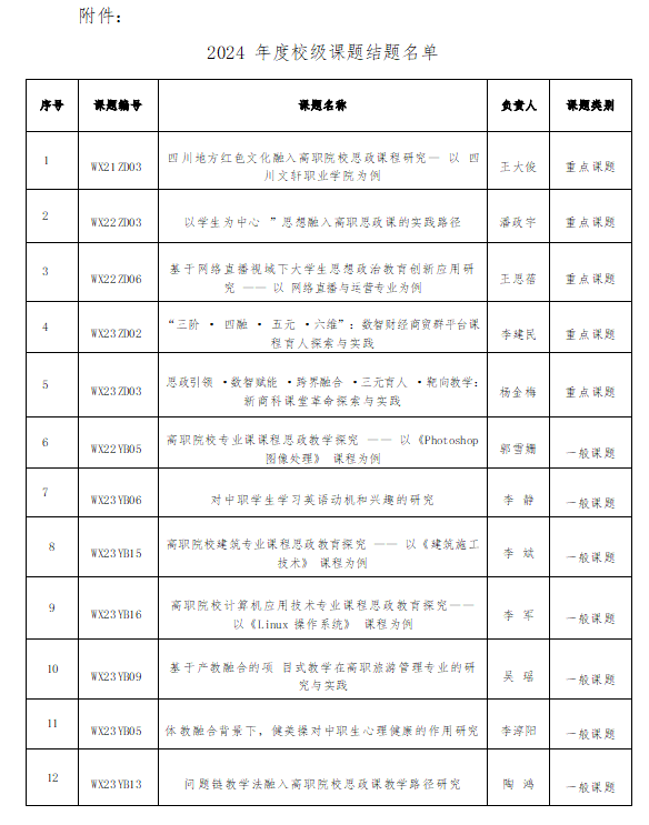 根据《四川文轩职业学院科研管理办法》和《关于2024年度校级课题结题评审结果的公示》[川文职院科〔2024〕44号]的要求,经专家组评审,科研处复核,公示复议后,18项校级课题完成研究工作,同意结题,现将结题名单(见附件)予以公布,请课题负责人到科研处领取结项证书。