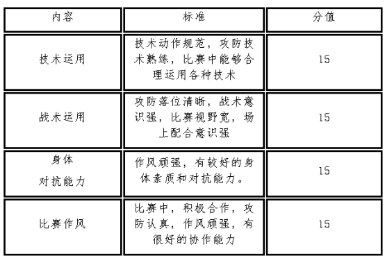 (1)测试方法:将加试运动员分成若干队,进行全场5对5或者3对3比赛。分队时应注意各个位置配备合理,比赛时间不低于10分钟。