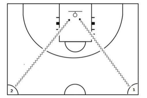 运球:考生在球场右侧中线与边线交叉点①站立(如上图所 示,①②均为以 40 厘米为半径的扇形),右手运球上篮,球投 中后右手运球至②后折返,换左手运球上篮,球进后左手运球 至①点,折返再进行一趟。以参赛选手起动开始计时,跑回终 点后计时停止。要求参赛选手在比赛时必须任意一脚踩到圆圈 线或圆圈内地面,方可变向,否则视为无效,不予计分;运球 上篮时球须投中,投不进可补投中,若球不中仍继续带球前进,视为无效,也不予计分。运球转身折返时,不得有夹带球等违例动作,否则计时加 0.5 秒。原则上参赛选手左右手各上篮两次,若违反规则,错一次追加 0.5 秒。每人测试一次。以完成项目的时间作为最终成绩。