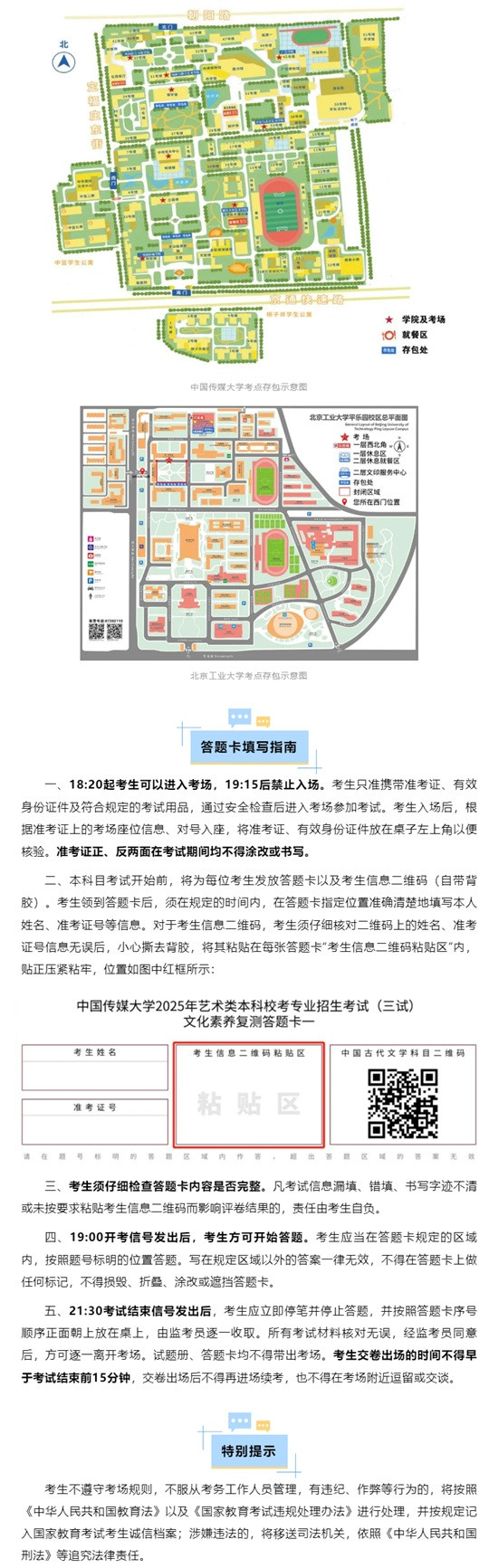 五、如考生在服务时间内未能取走寄存包,两个考点的考生均可于考试结束后第二天持本人有效身份证件、校考准考证、存取凭证,到招生处(