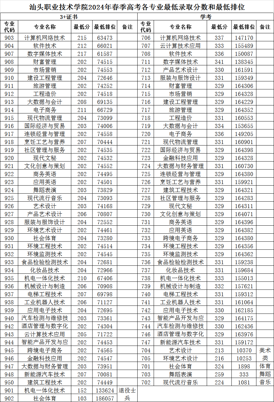 附:汕头职业技术学院2024年春季高考各专业最低录取分数和最低排位
