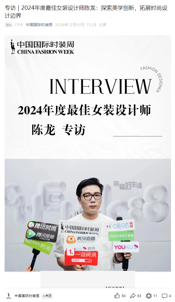 中国国际时装周对2024年度最佳女装设计师陈龙进行了专访,以下为新闻链接: