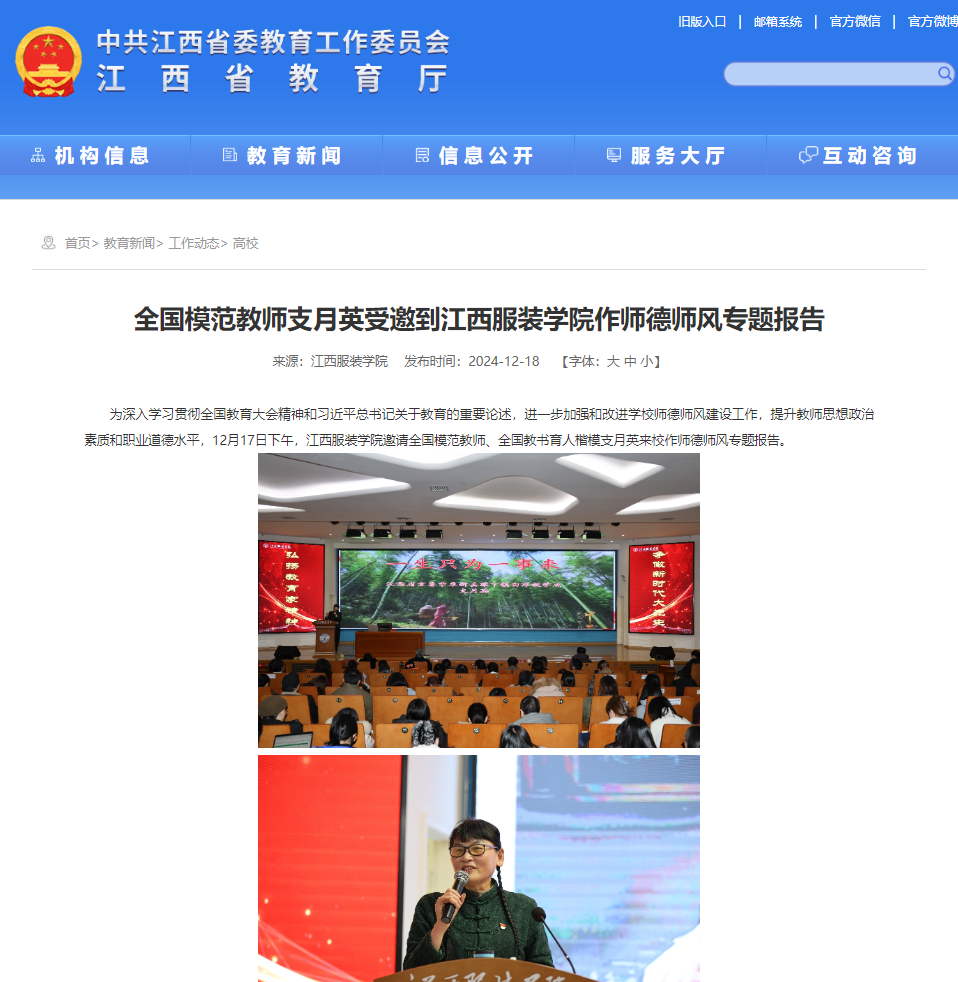 为深入学习贯彻全国教育大会精神和习近平总书记关于教育的重要论述,进一步加强和改进学校师德师风建设工作,提升教师思想政治素质和职业道德水平,12月17日下午,江西服装学院邀请全国模范教师、全国教书育人楷模支月英来校作师德师风专题报告。