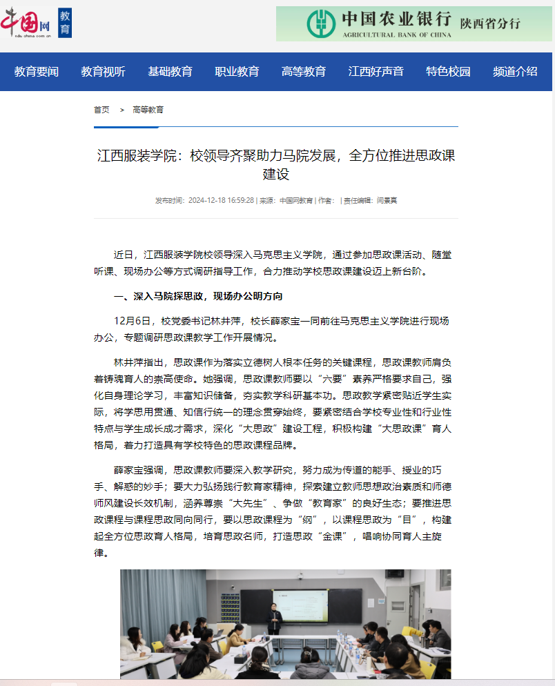近日,江西服装学院校领导深入马克思主义学院,通过参加思政课活动、随堂听课、现场办公等方式调研指导工作,合力推动学校思政课建设迈上新台阶。江西服装学院通过一系列扎实有效的举措,深入马克思主义学院开展全方位、多层次的调研指导工作,为思政课建设注入了强大动力。接下来,学校将继续不断探索创新思政课建设路径,持续提升思政教育工作水平,为培养担当民族复兴大任的时代新人而不懈努力。