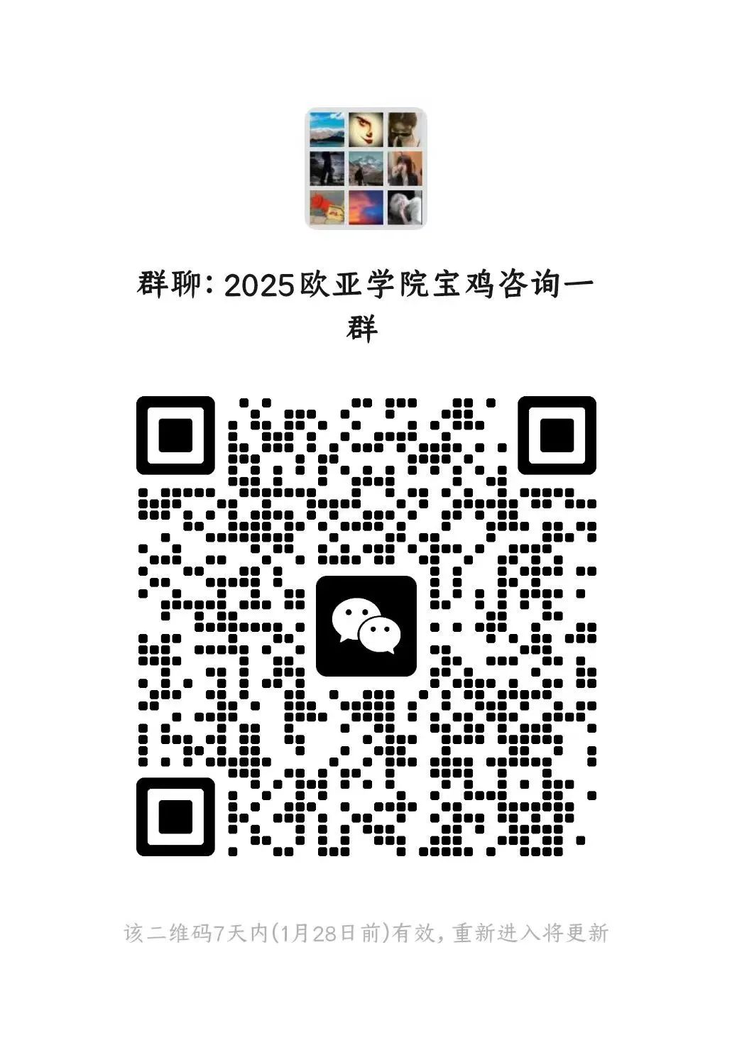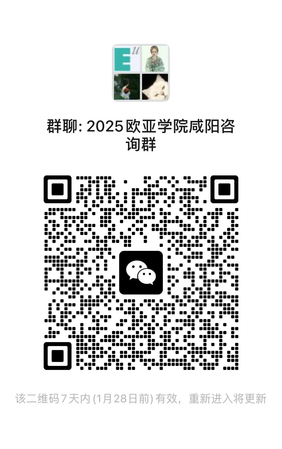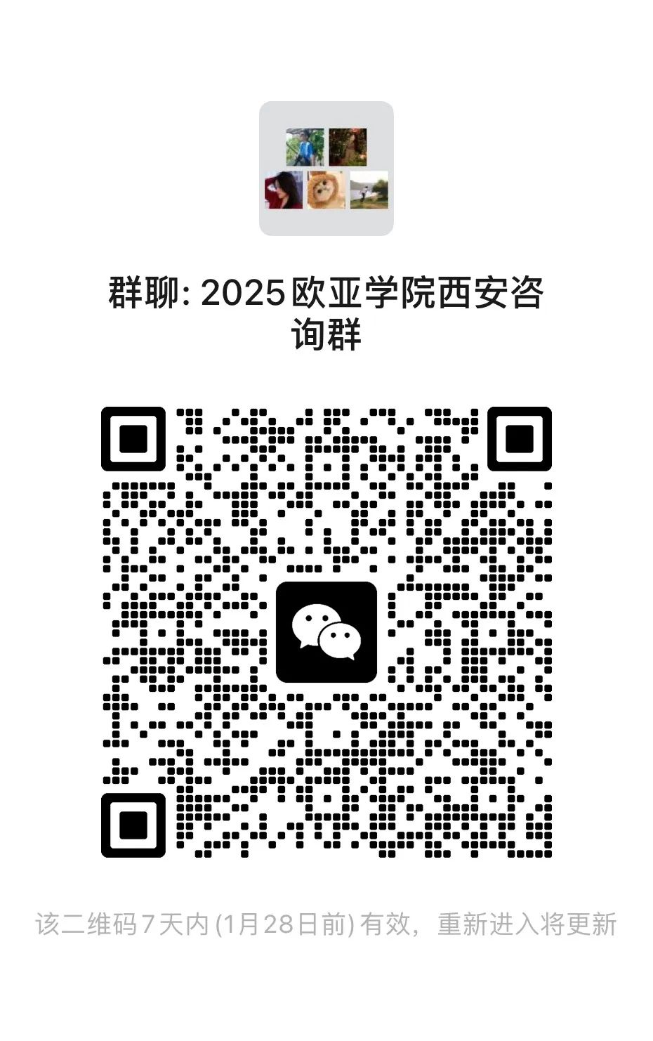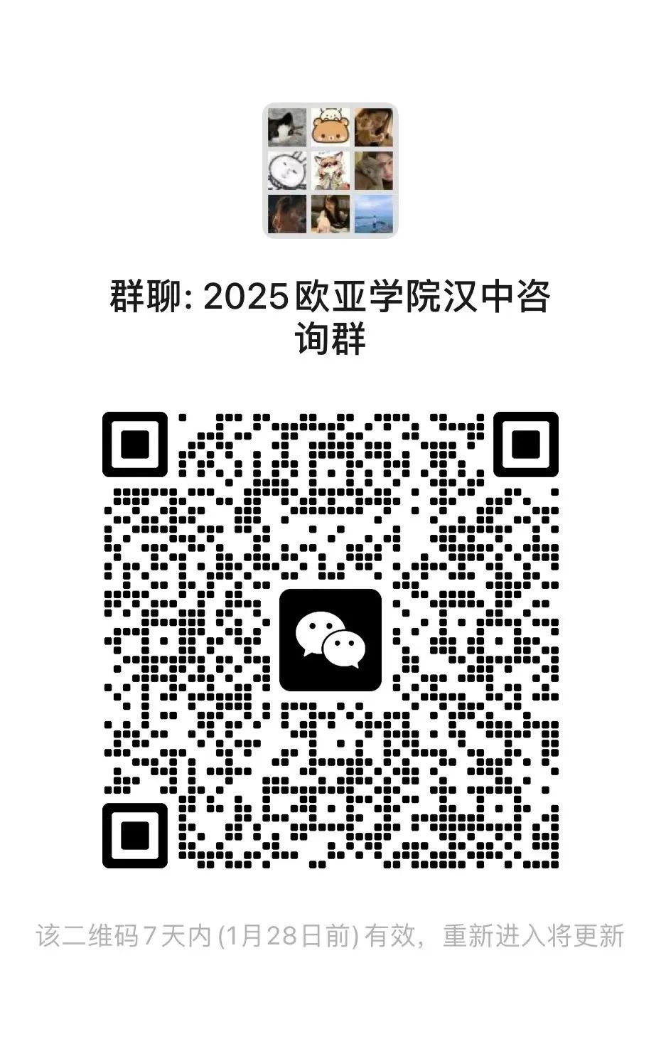 西安欧亚学院2025年招生微信群 开通啦!老师们将在云端带来专业暖心的咨询服务 快来加群吧~为方便考生及家长咨询,我们建立了微信咨询群,考生和家长可以扫码入群进行咨询,老师会为你进行一一解答。