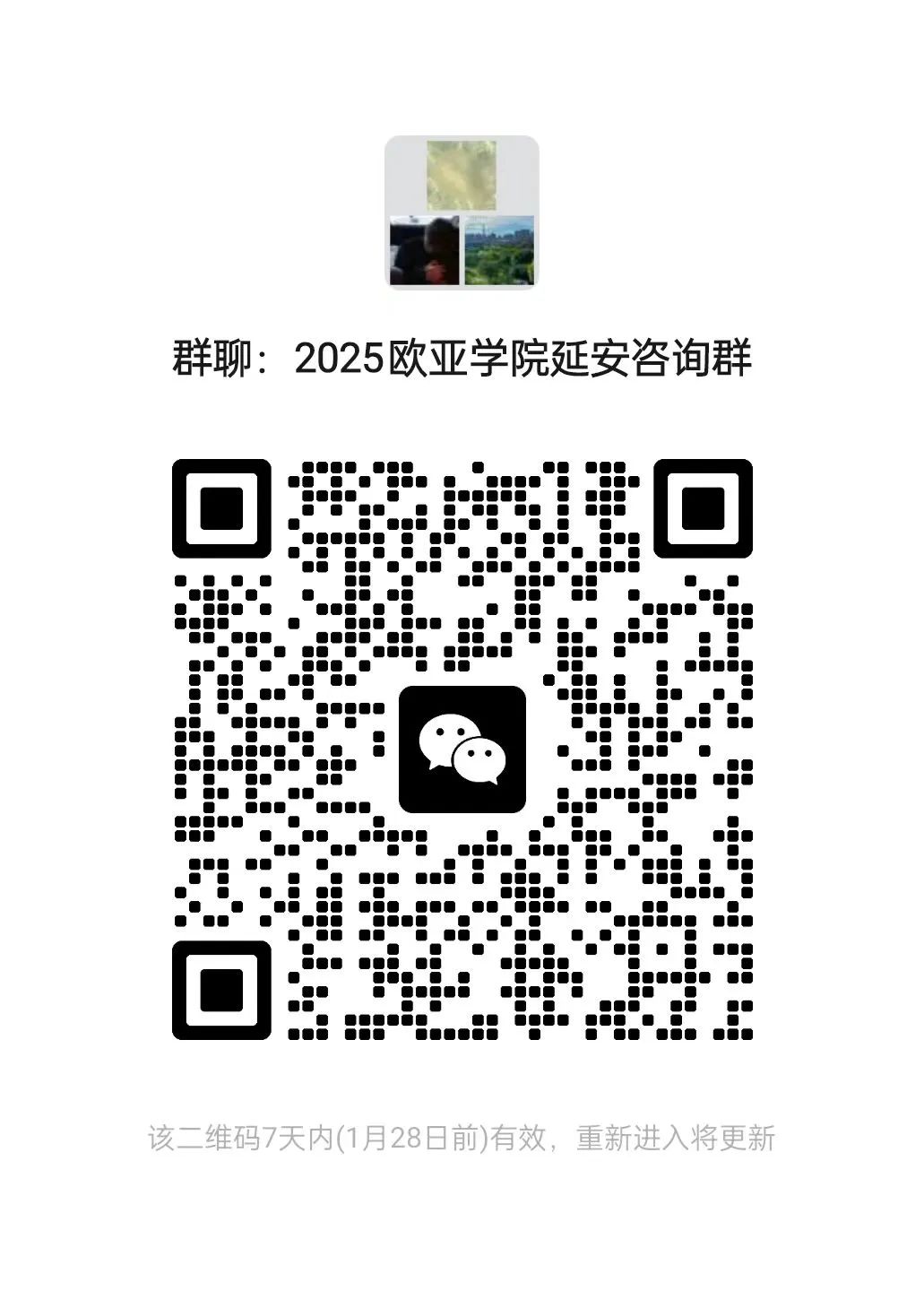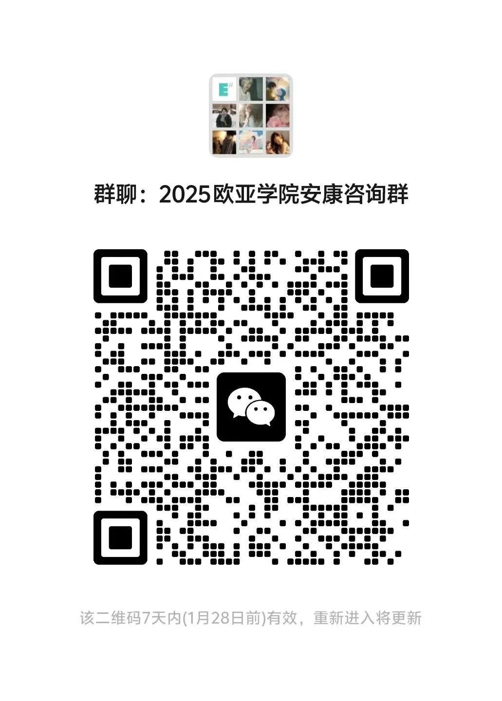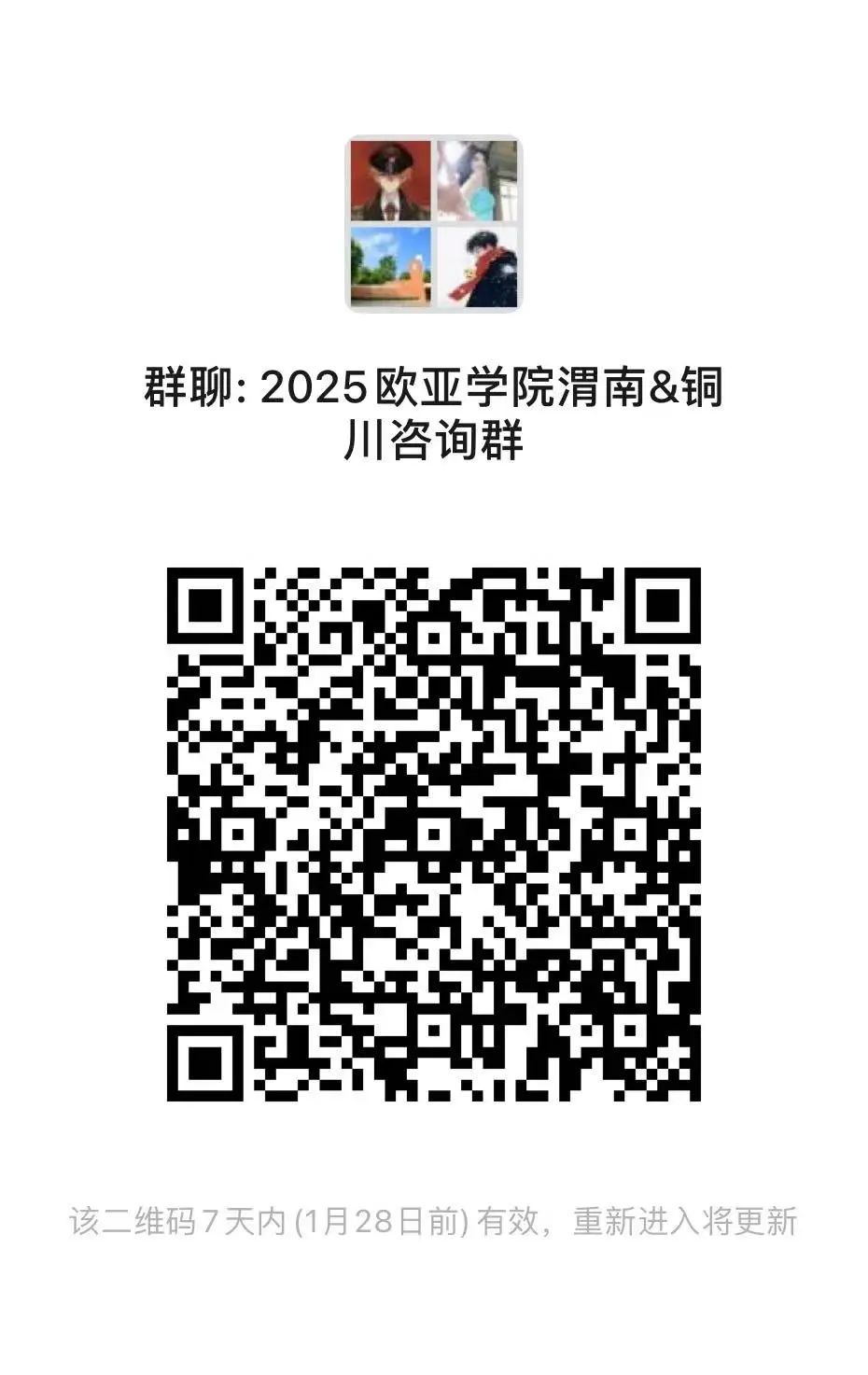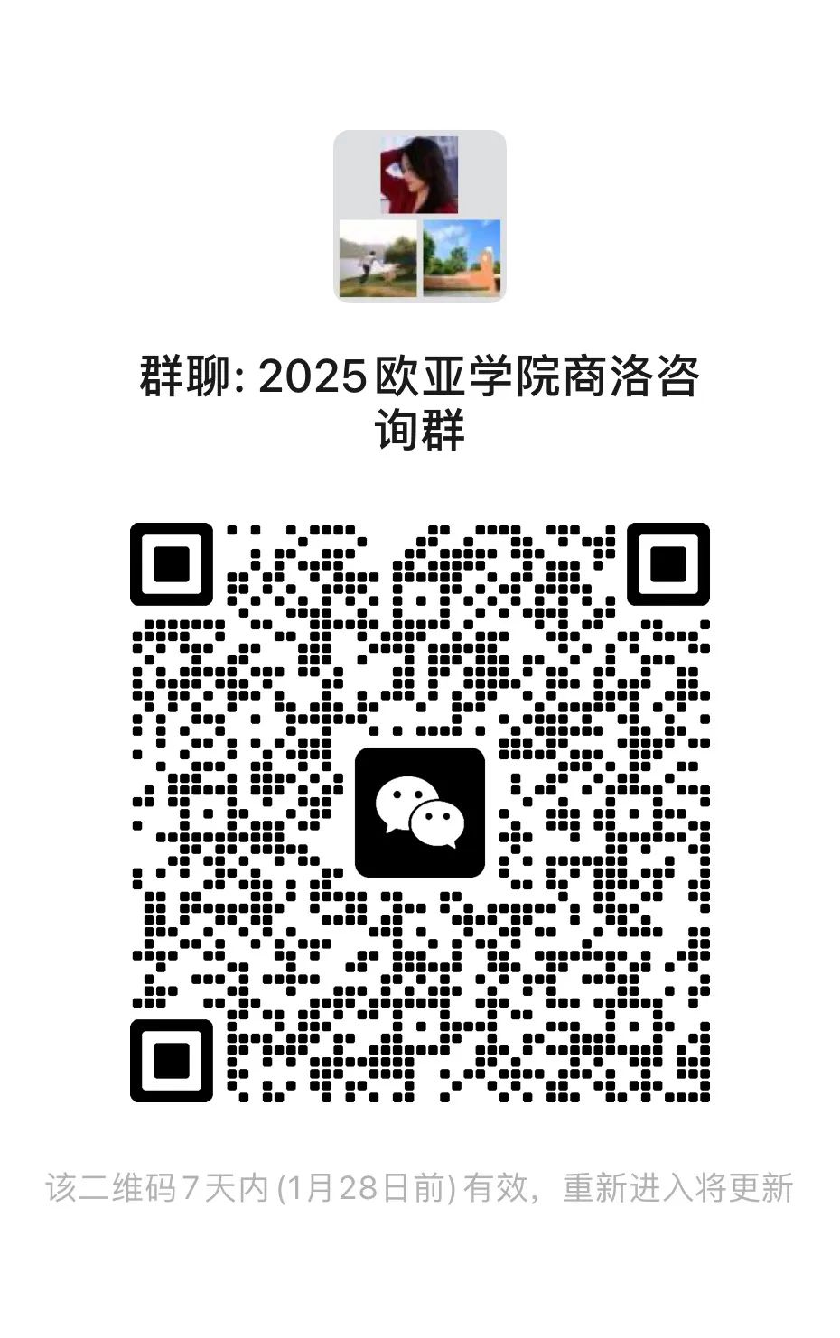 西安欧亚学院2025年招生微信群 开通啦!老师们将在云端带来专业暖心的咨询服务 快来加群吧~为方便考生及家长咨询,我们建立了微信咨询群,考生和家长可以扫码入群进行咨询,老师会为你进行一一解答。