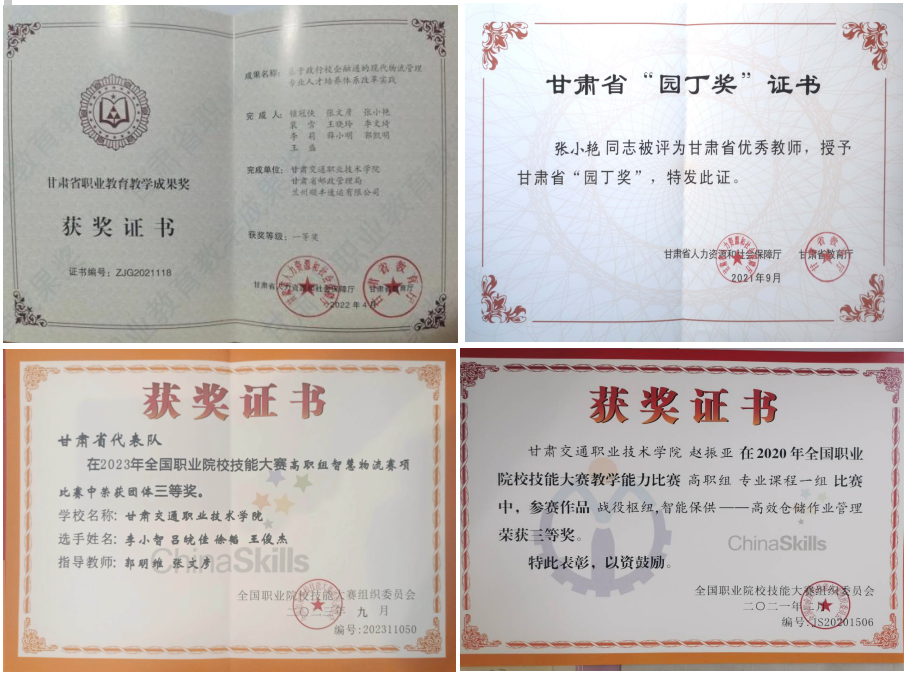 1.省级教学团队4个;2.省级名师工作室3个;3.全国邮政快递职业教育教学指导委员会委员1名;4.全国物流行业教学名师1名;5.甘肃省园丁奖获得者1名;6.甘肃省大学生就业创业导师1名;7.省级在线精品课程4门;8.教师教学能力比赛中,获教育部三等奖2次、甘肃省二等奖以上8次;9.获甘肃职业教育教学成果一等奖2次、二等奖1次;10.获甘肃省哲学社会科学优秀成果三等奖1次;11.指导学生参加各级各类竞赛,获国赛三等奖5项,省赛一等奖10余项、二等奖10余项;12.近几年,学院教师承担省部级项目5项、地厅级70余项,累计发表论文100余篇,主编教材10余部。