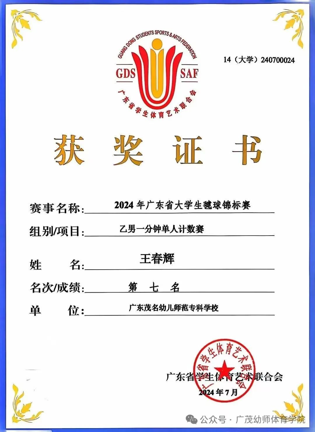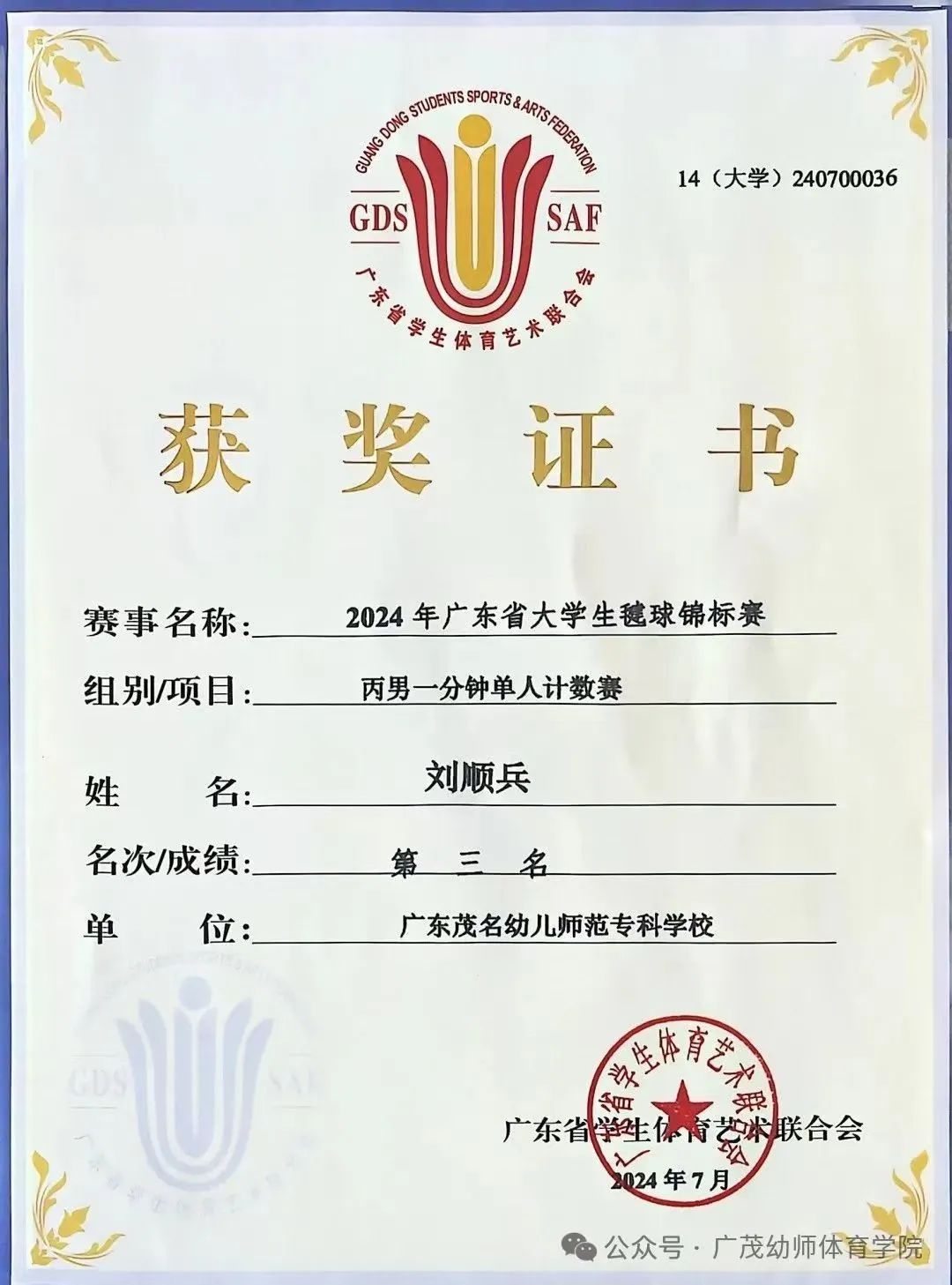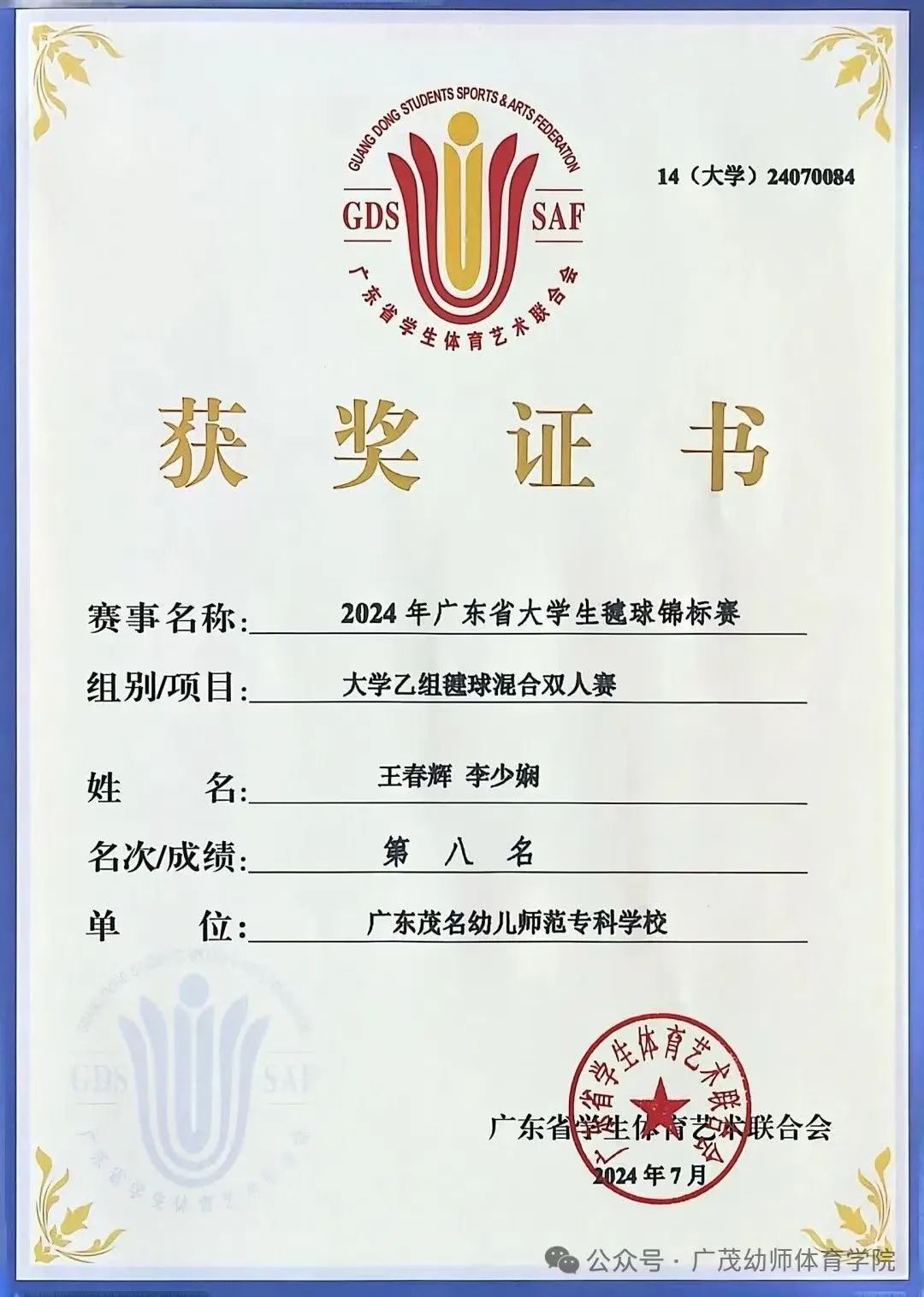 2024年广东省大学生毽球比赛,获乙组女子花毽一分钟计数赛第一名、丙组男子花毽一分钟计数赛第三名、乙组男子花毽一分钟计数赛第七名、乙组混双第八名、乙组团体排名第八名。