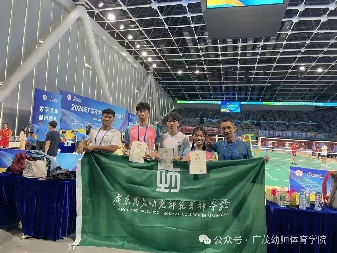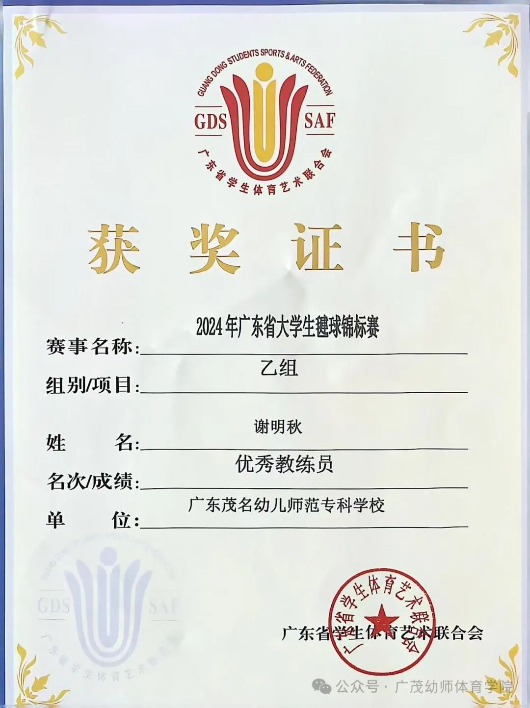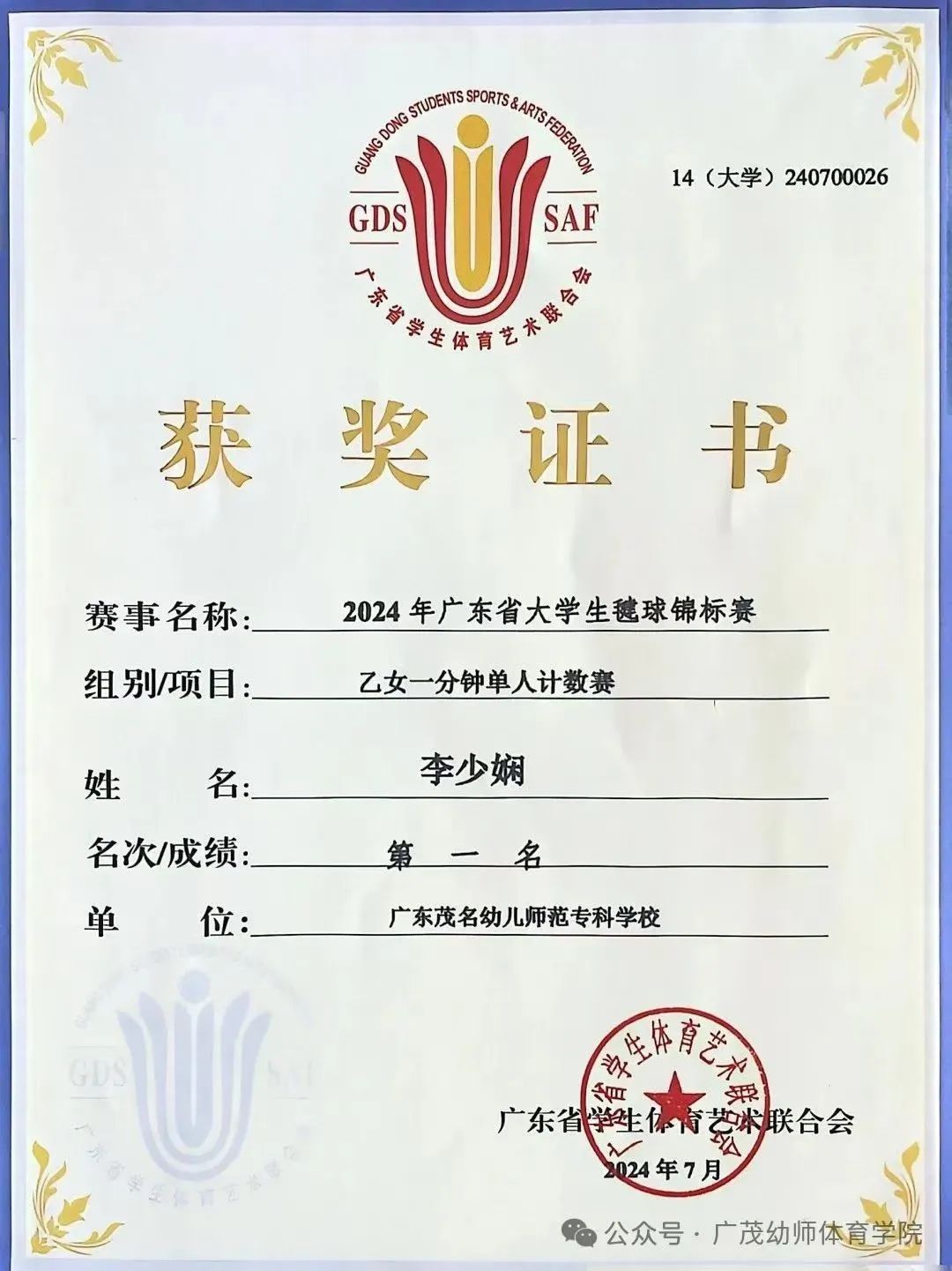 2024年广东省大学生毽球比赛,获乙组女子花毽一分钟计数赛第一名、丙组男子花毽一分钟计数赛第三名、乙组男子花毽一分钟计数赛第七名、乙组混双第八名、乙组团体排名第八名。