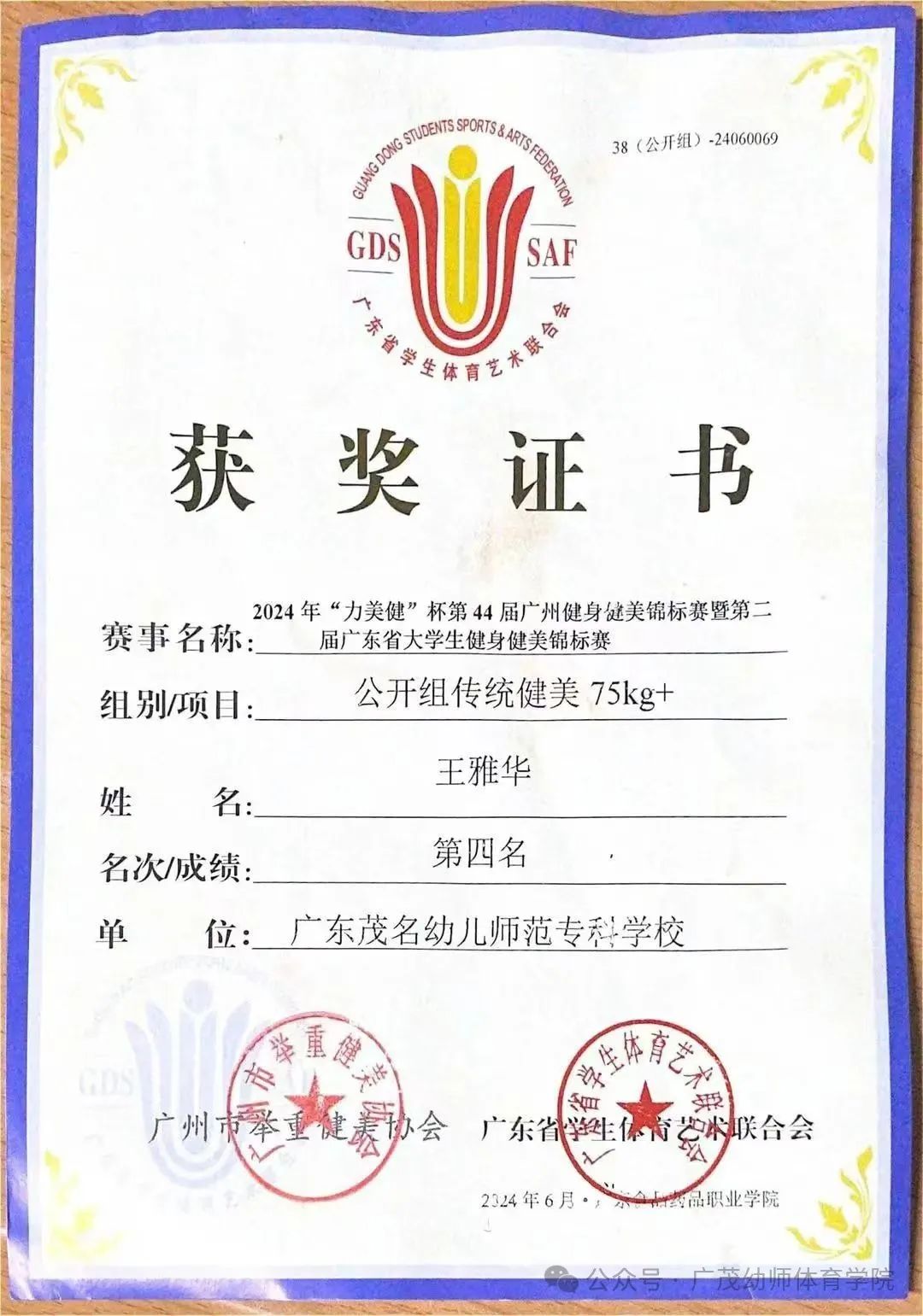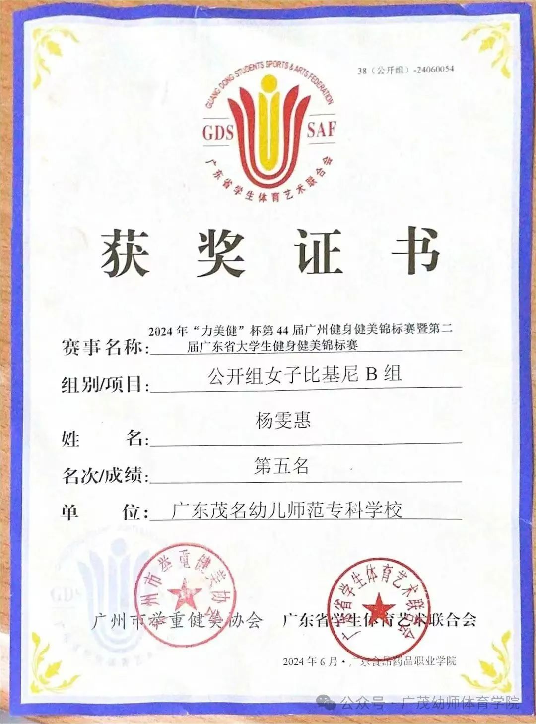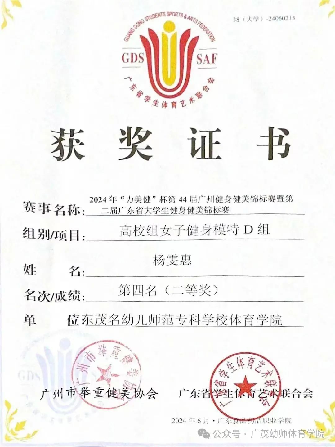 2024年第二届广东省大学生健身健美锦标赛,获高校组女子健身模特D组二等奖、传统健美70Kg三等奖两项,公开组传统健美75Kg二等奖、古典健美175-180cm二等奖、公开组女子比基尼B组二等奖。