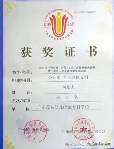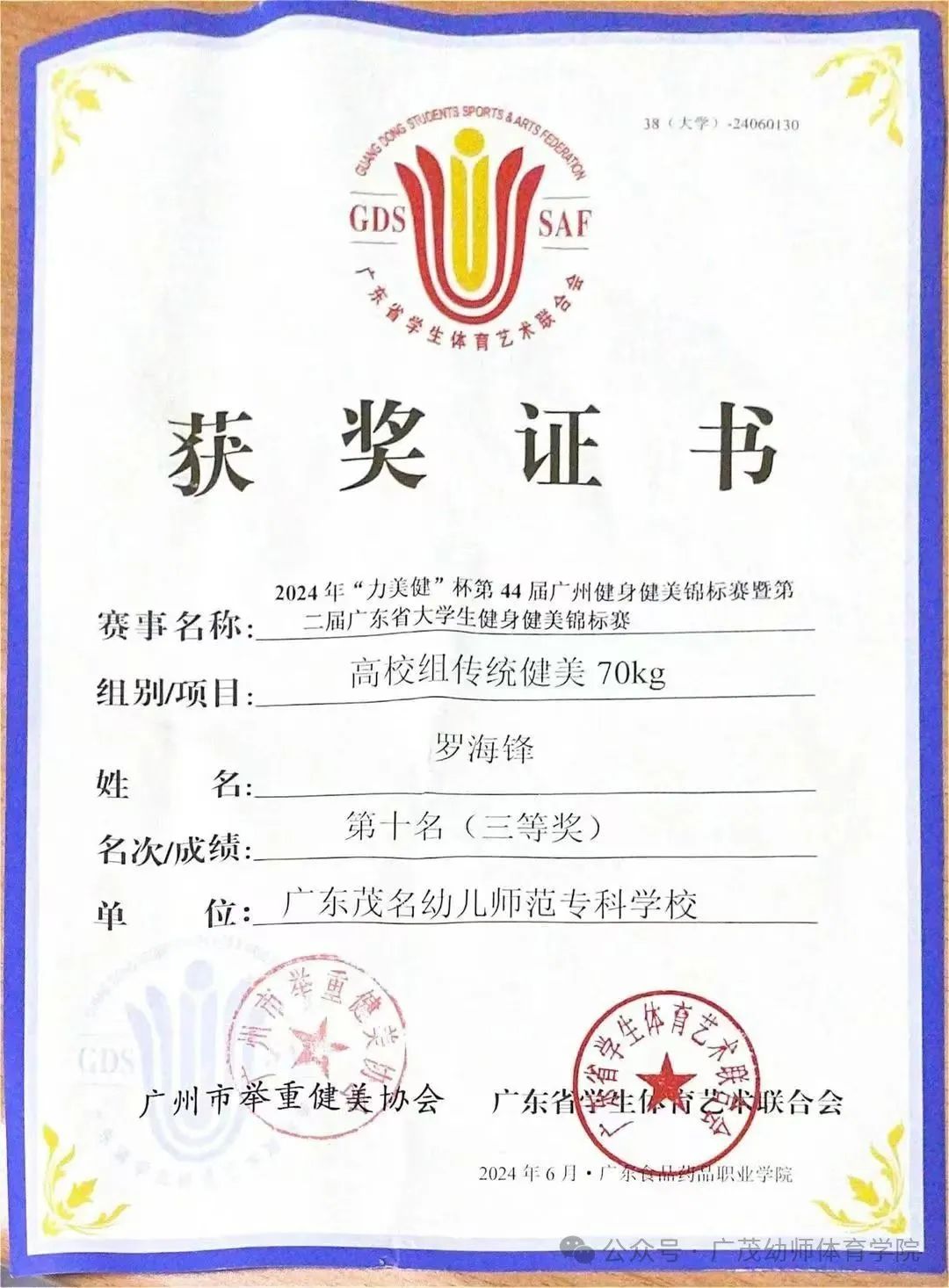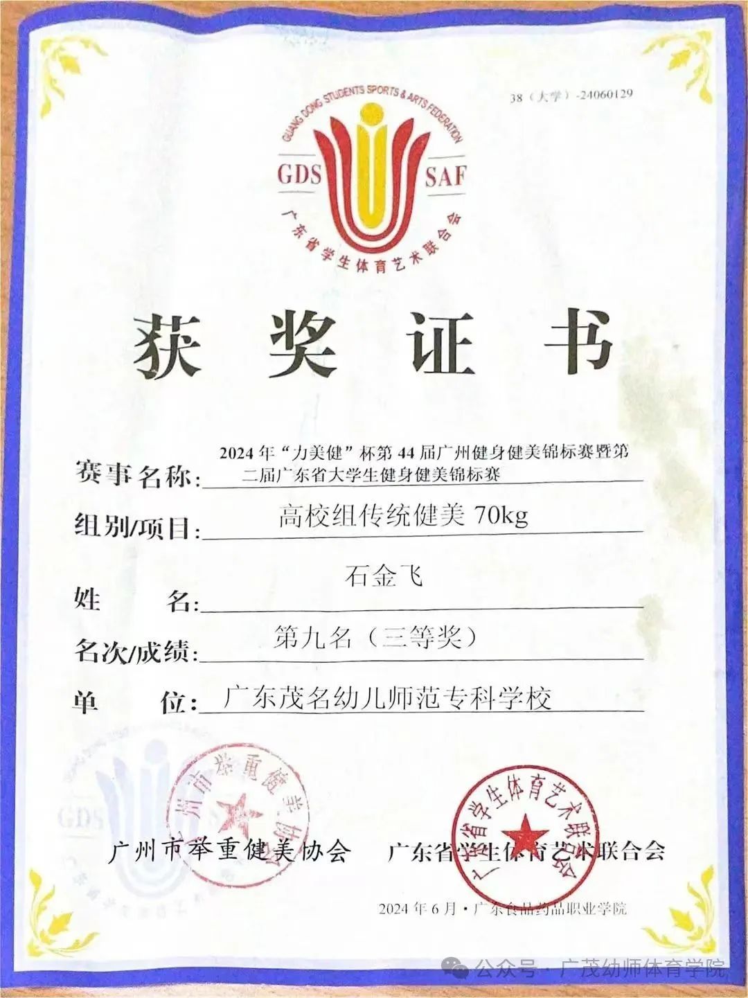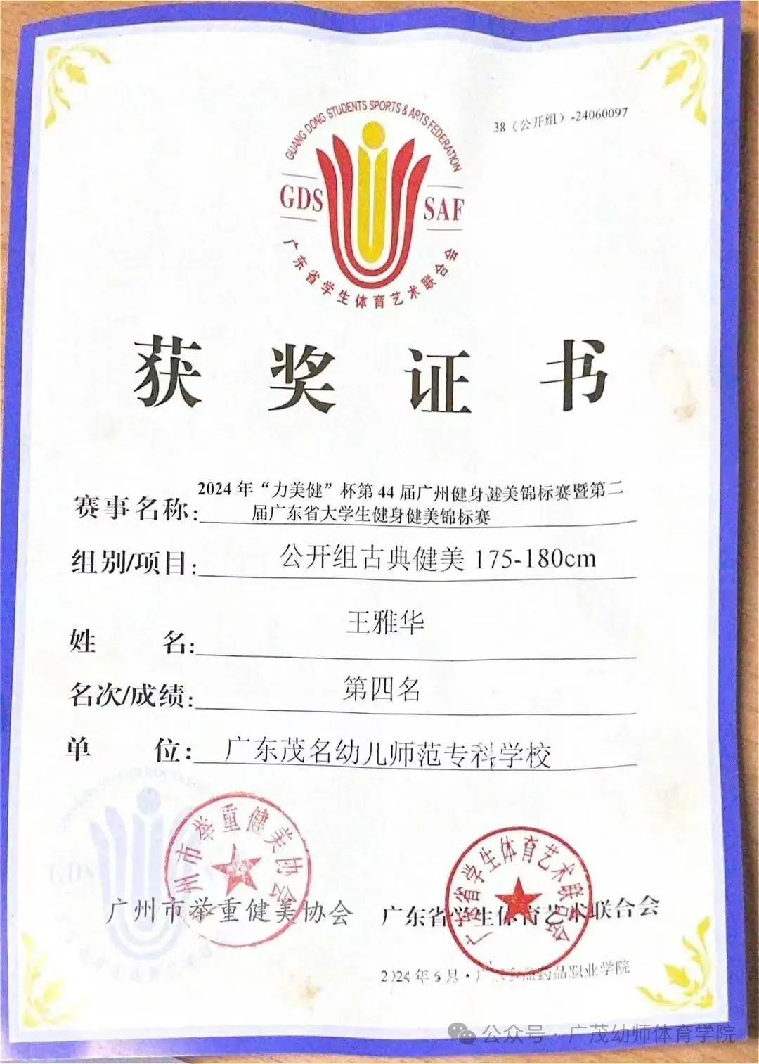 2024年第二届广东省大学生健身健美锦标赛,获高校组女子健身模特D组二等奖、传统健美70Kg三等奖两项,公开组传统健美75Kg二等奖、古典健美175-180cm二等奖、公开组女子比基尼B组二等奖。
