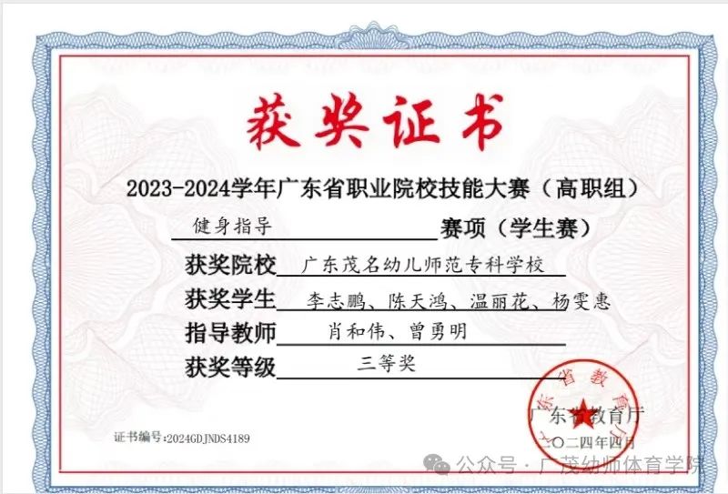 2023-2024学年广东省职业院校技能大赛(高职组)健身指导赛项(学生赛),荣获三等奖。