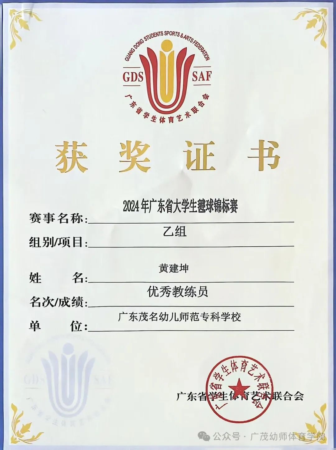 2024年广东省高校体育教师教学与训练技能展示大赛,黄建坤老师获足球项目一等奖、郭露诗老师获排球项目二等奖。