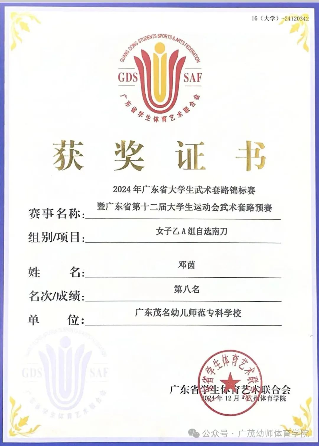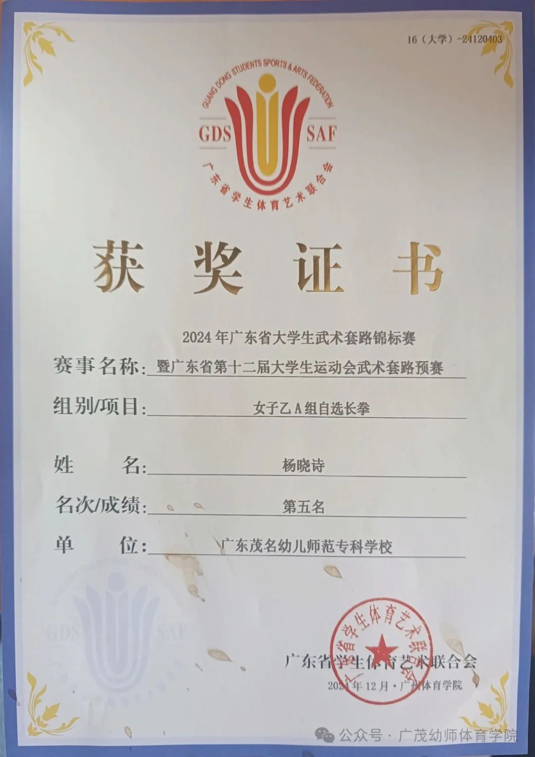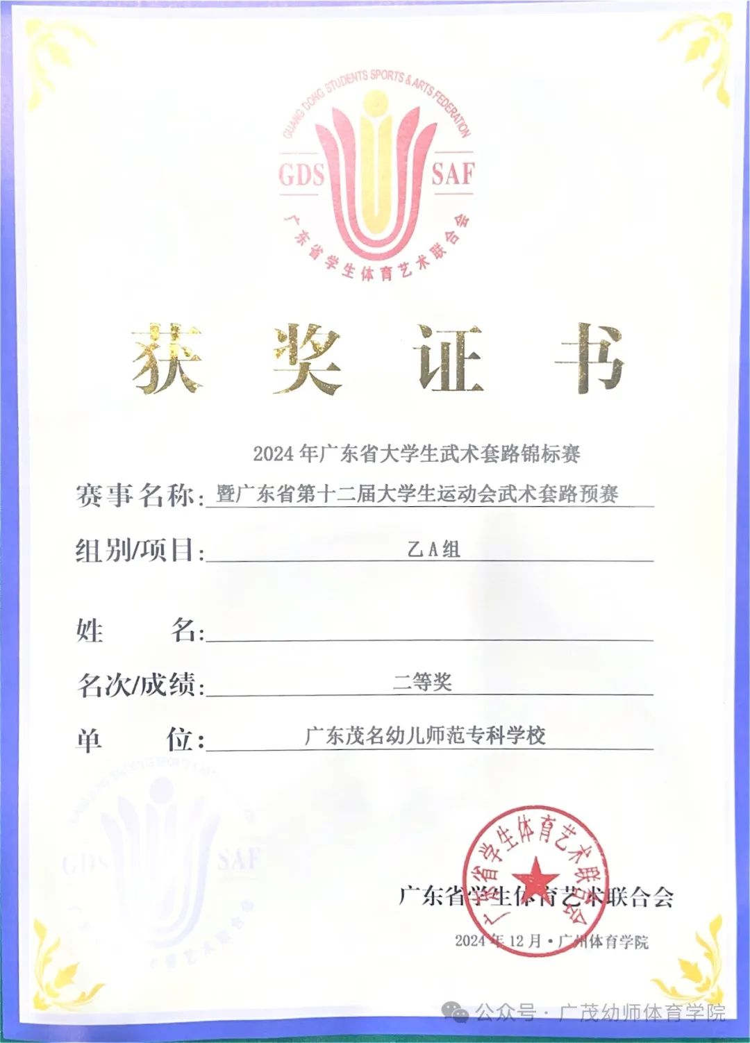 2024年广东省大学生武术套路锦标赛暨广东省第十二届大学生运动会武术套路预赛获女子自选枪术第三名、女子自选长拳第五名、女子自选剑术第七名、女子自选南刀第八名,乙A组团体总分二等奖。