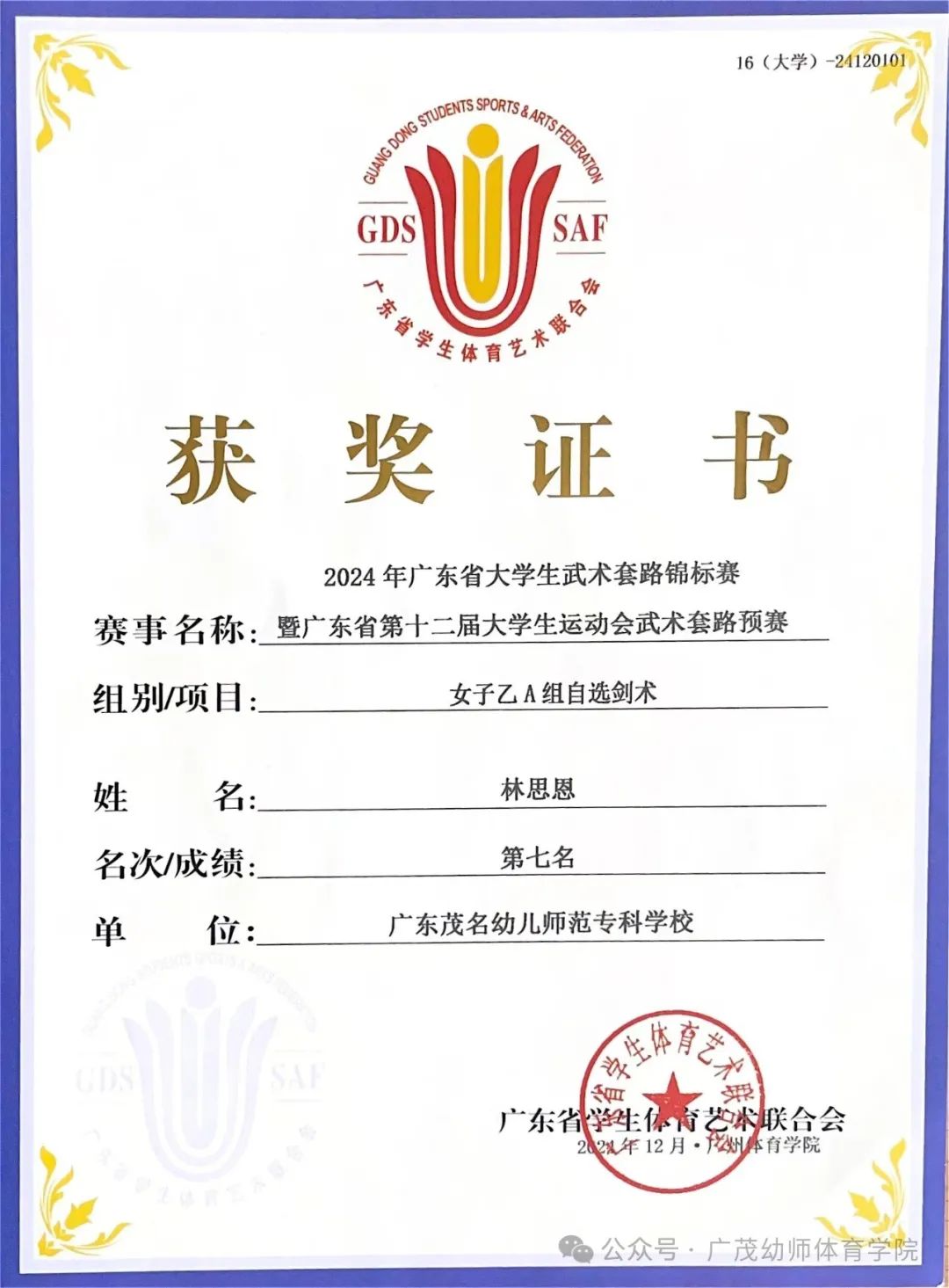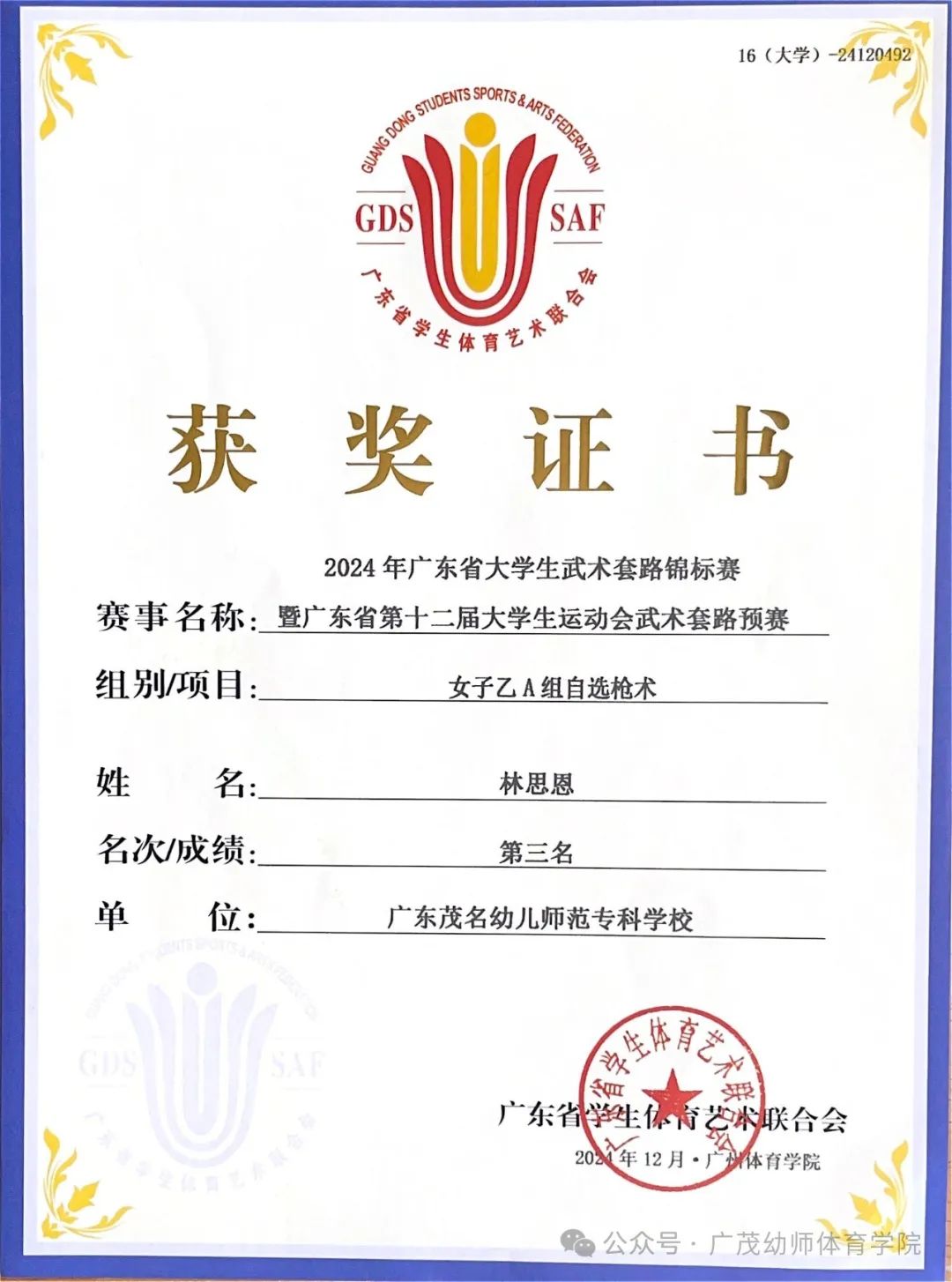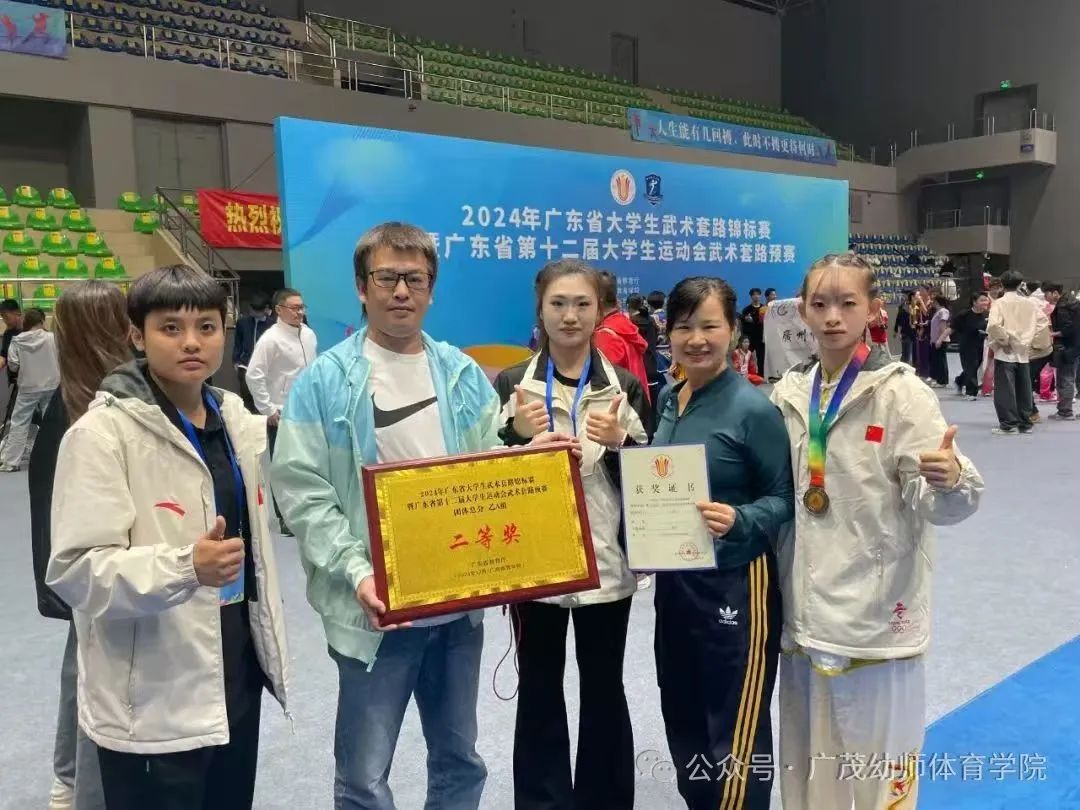 2024年广东省大学生武术套路锦标赛暨广东省第十二届大学生运动会武术套路预赛获女子自选枪术第三名、女子自选长拳第五名、女子自选剑术第七名、女子自选南刀第八名,乙A组团体总分二等奖。