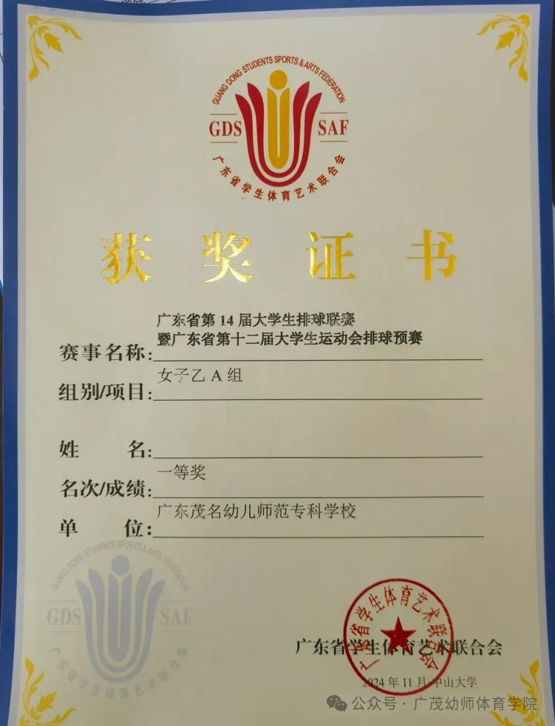 2024年广东省第十四届大学生排球联赛暨广东省第十二届大学生运动会排球预赛获第五名(一等奖)。
