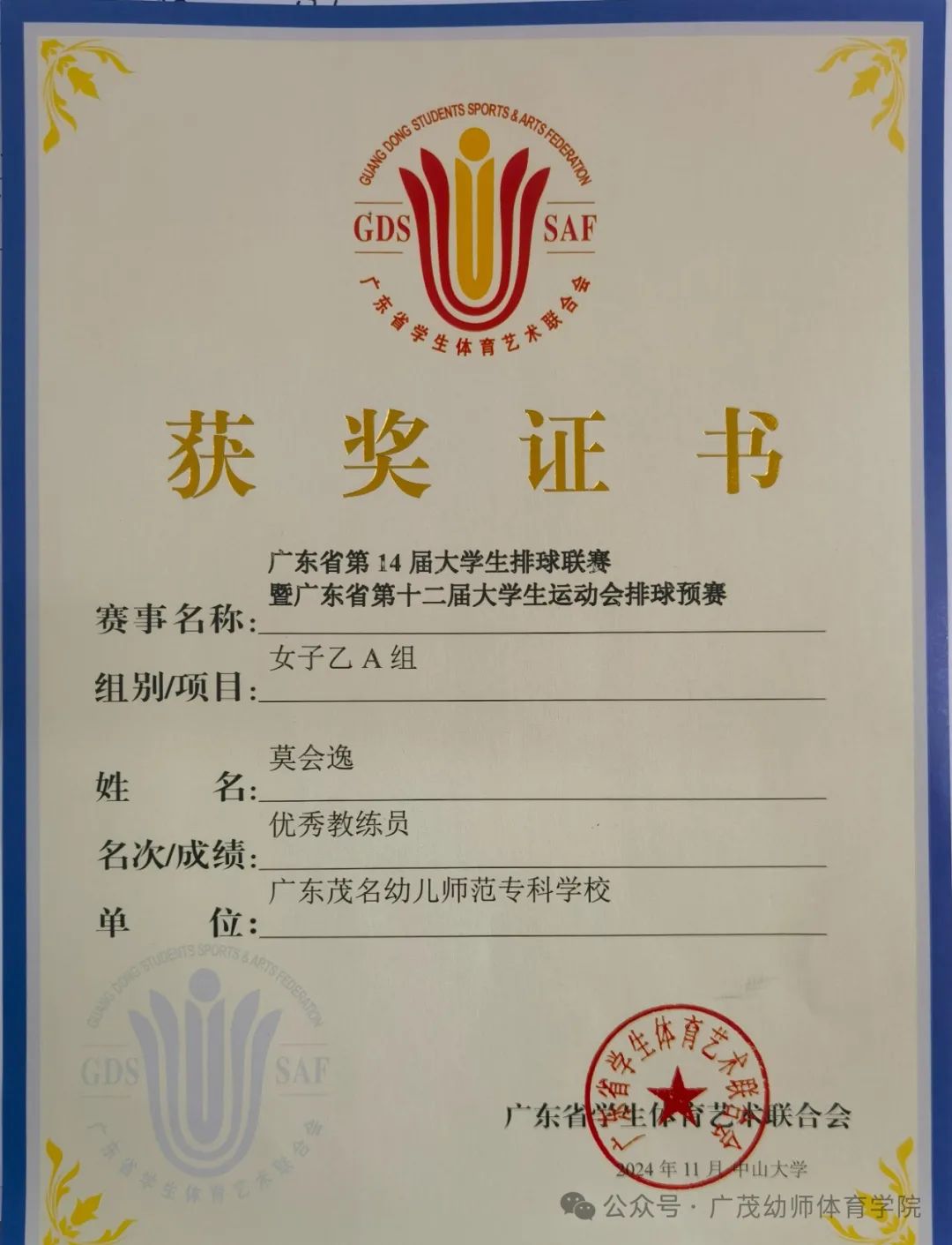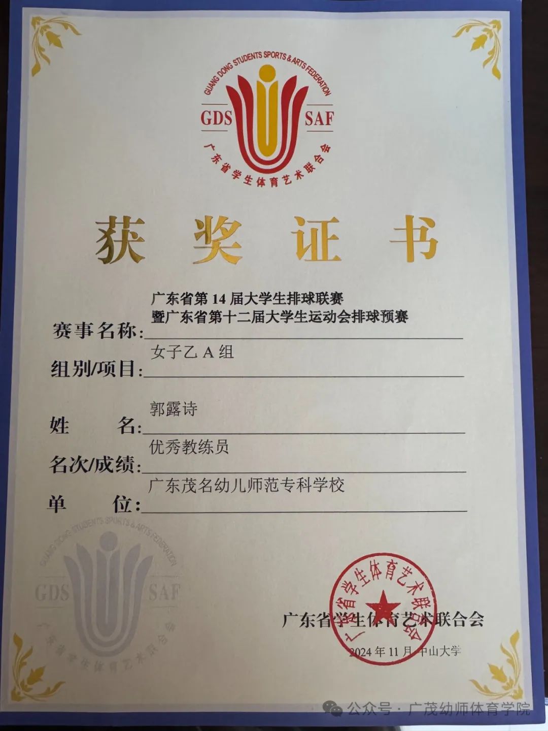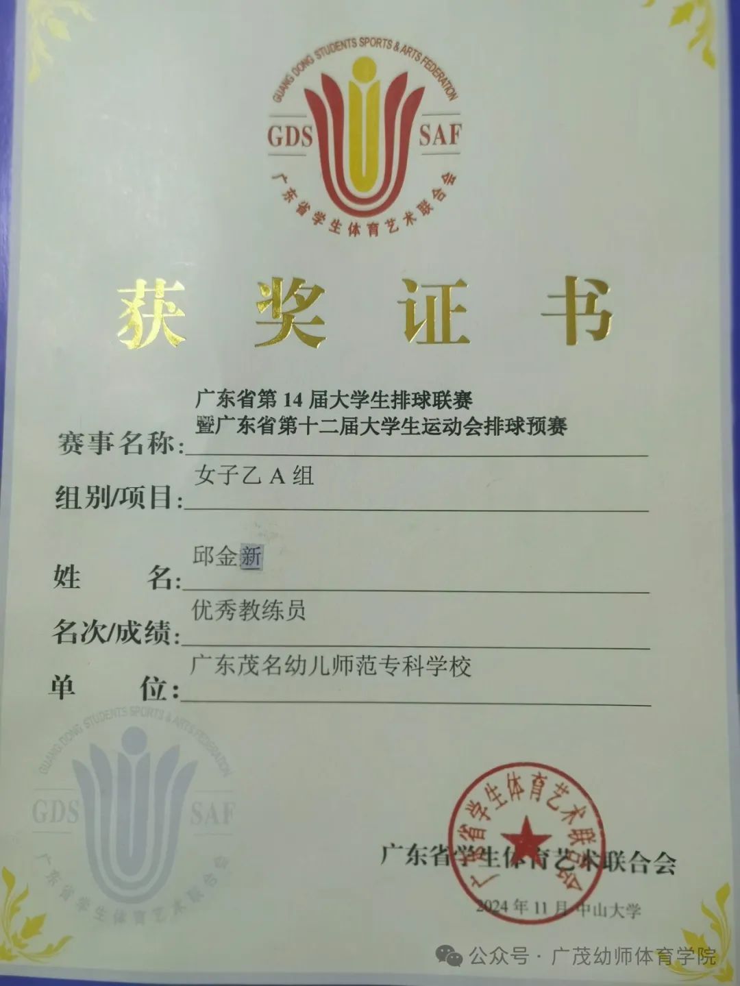 2024年广东省第十四届大学生排球联赛暨广东省第十二届大学生运动会排球预赛,邱金新、莫会逸、郭露诗三位老师获“优秀教练员”称号!