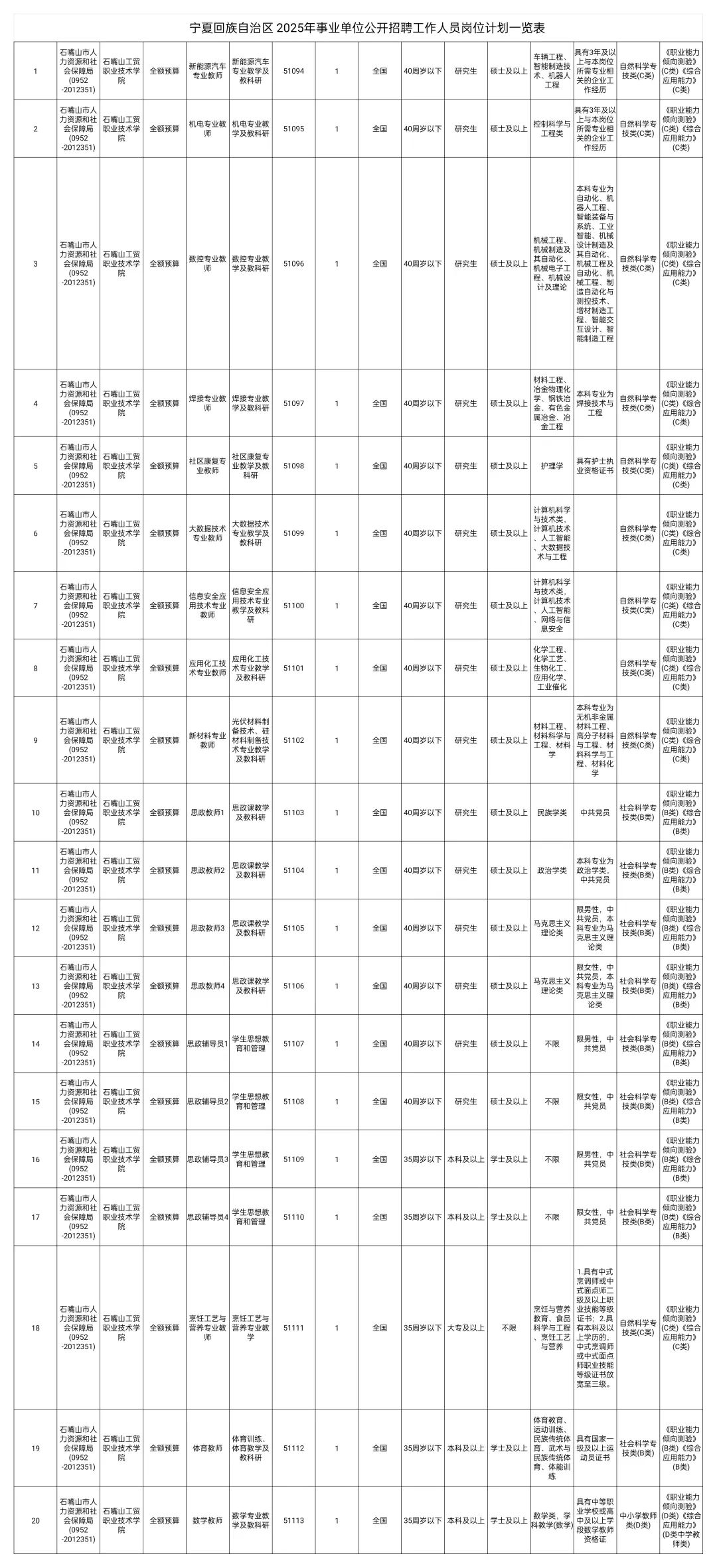 宁夏回族自治区2025年度事业单位公开招聘工作正式启动!为进一步加强学院教师队伍建设,优化人才结构,石嘴山工贸职业技术学院计划招聘德才兼备、专业扎实的优秀人才20人。