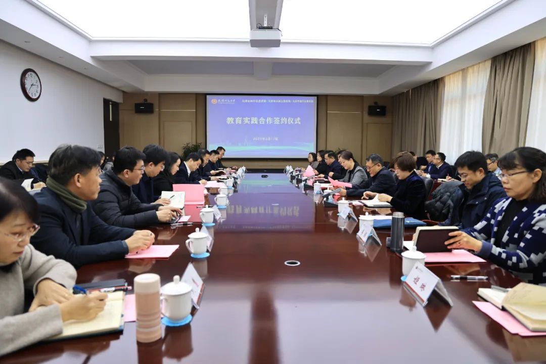 为贯彻落实《教育强国建设规划纲要(2024-2035)》,培养适应时代要求的高素质创新型教师,加快建设教育强国,2月17日,在中共天津市委教育工作委员会、天津市教育委员会的组织下,天津师范大学与天津市优质教育区教育局、中小学围绕“区校深度合作,共育卓越教师”进行深入研讨交流,形成培养高端教师的共识和具体举措,并举行教育实践合作签约仪式。市委教育工委副书记刘怡蔓,市教育两委二级巡视员、人事处处长陈长征,和平区政协副主席、区教育局党委书记、局长明建平,河西区教育局党委书记、局长杨琳,南开区教育局党委书记、局长孙建昆,我校校长巩金龙出席研讨会与签约仪式。副校长纪德奎主持会议。