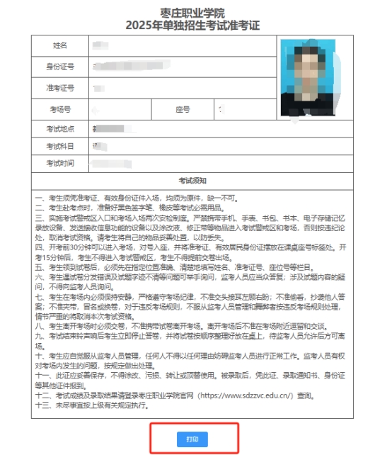 枣庄职业学院2025年单独招生考试准考证打印操作说明