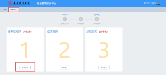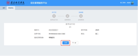 3.点击单独招生,进入准考证打印,核对个人信息,点击打印