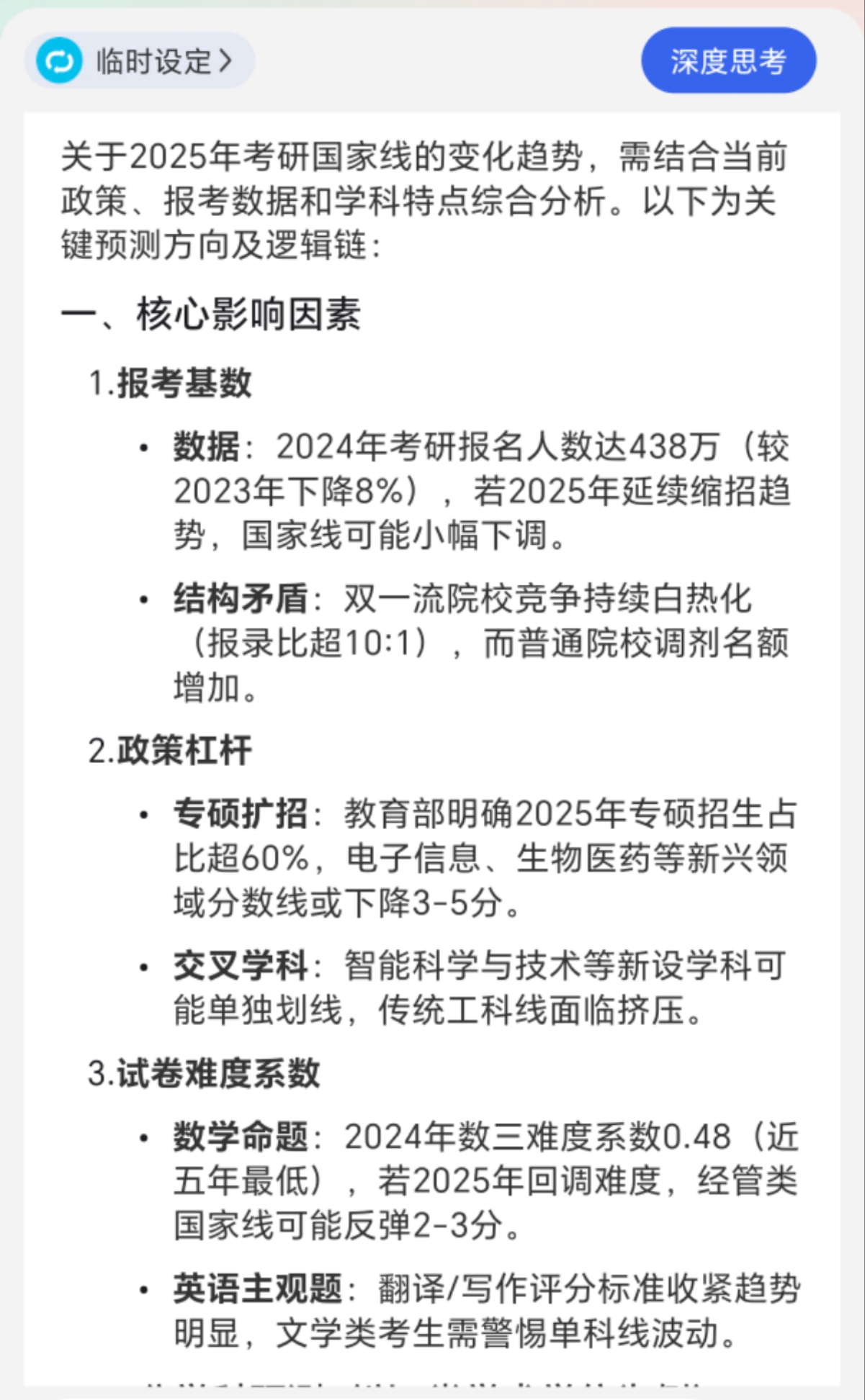 考研成绩一公布,接下来大家最关注的就是今年考研国家线是如何变化的,小优询问了最近大热的deepseek,看看它是怎么分析的,一起了解~