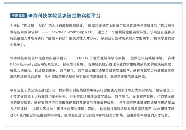 12月24日,由中国电子技术标准化研究院联合微众银行、金链盟共同编制的《2024 FISCO BCOS产业应用发展报告》正式发布,我校金融与贸易学院区块链金融实验教学平台案例成功入选。