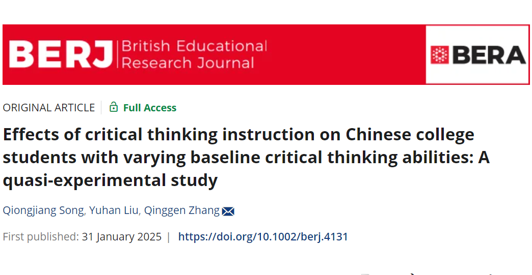 近日,教育科学研究院宋琼将老师在教育学研究领域中取得新进展。该研究成果以“Effects of critical thinking instruction on Chinese college students with varying baseline critical thinking abilities: A quasi-­ experimental study”为题,发表于教育学国际期刊《British Educational Research Journal》。