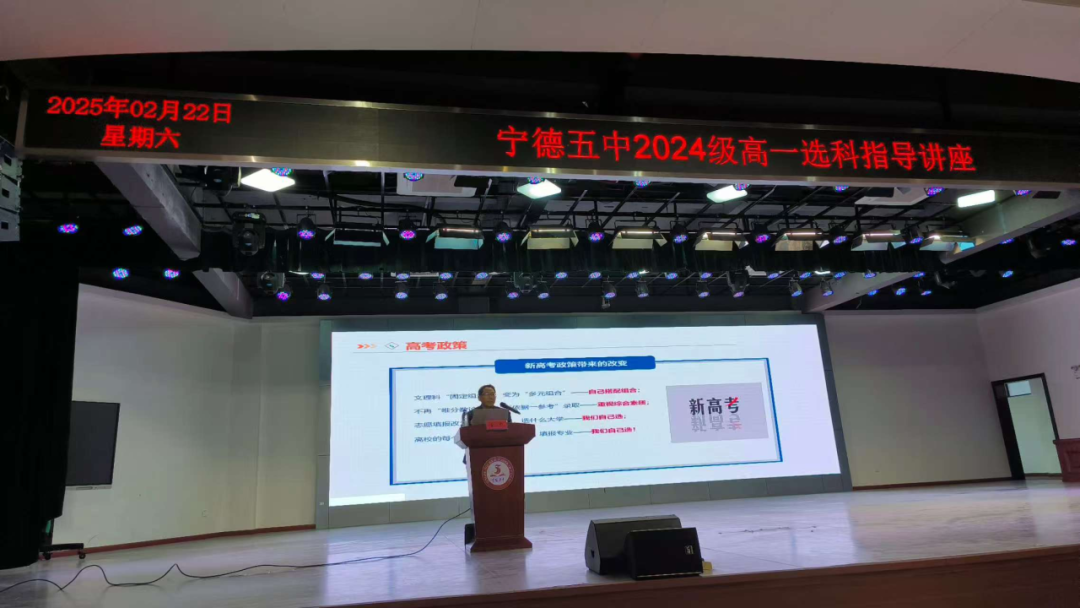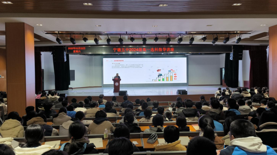 仪式结束后,在宁德五中报告厅,由教务处招生考试科余力老师为高一年级师生做了《新高考下的高中选科》专题讲座,以新高考改革为前提,结合大学招生录取规则、大学学科和专业的介绍,强调高一选科的重要性,深入浅出讲解各种选科组合内容及特点,为高一学生的选科组合提供应对策略。通过“找强项”、“找方向”、“定选科”三步法为同学们指明方向,并结合选科案例分析给予建议,让同学们对未来的高考奋斗更有信心,受到了与会师生的热烈好评。