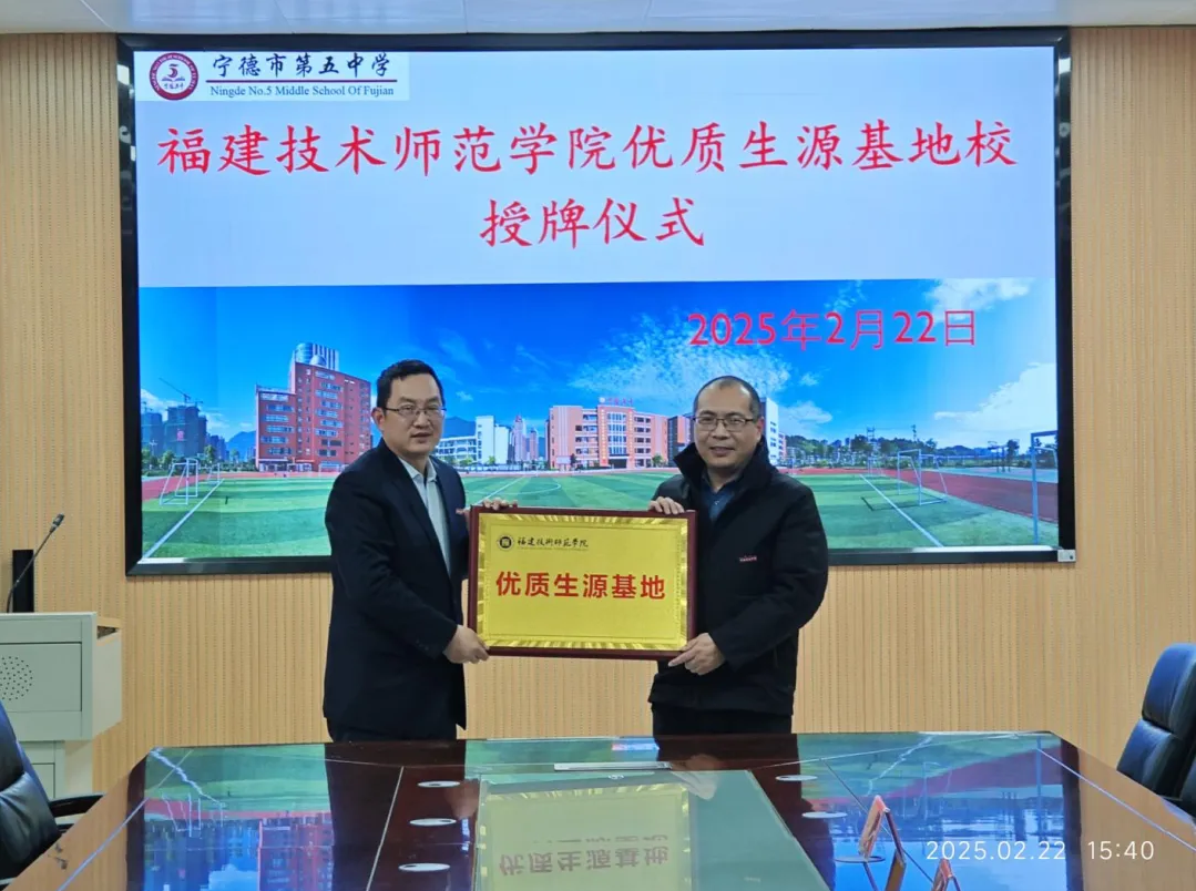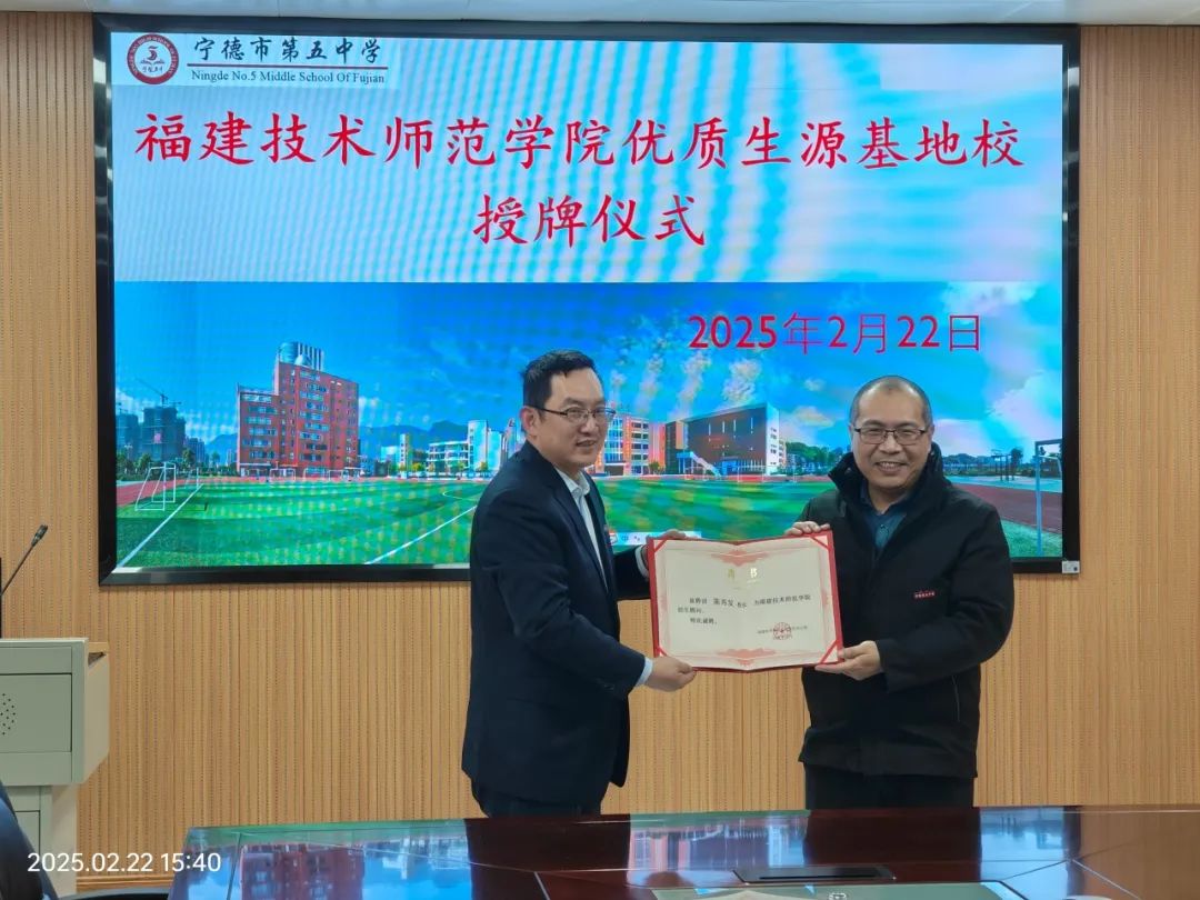 为了符合国家教育改革的趋势,促进高等教育和基础教育的密切融合,做好大中学衔接,共同探索学生未来发展的各种可能性,培养更多具有创新精神和实践能力的高素质应用型人才。2月22日下午,我校“优质生源基地”授牌仪式在宁德五中举行,我校教务处副处长兼招生办主任林宗栋、教务处招生考试科余力老师和宁德五中校领导参加了授牌仪式。会上,林宗栋副处长为宁德五中授“福建技术师范学院优质生源基地”铭牌,并为宁德五中陈再发校长颁发“福建技术师范学院优质生源招生顾问”聘书,开启了两校合作的序幕。