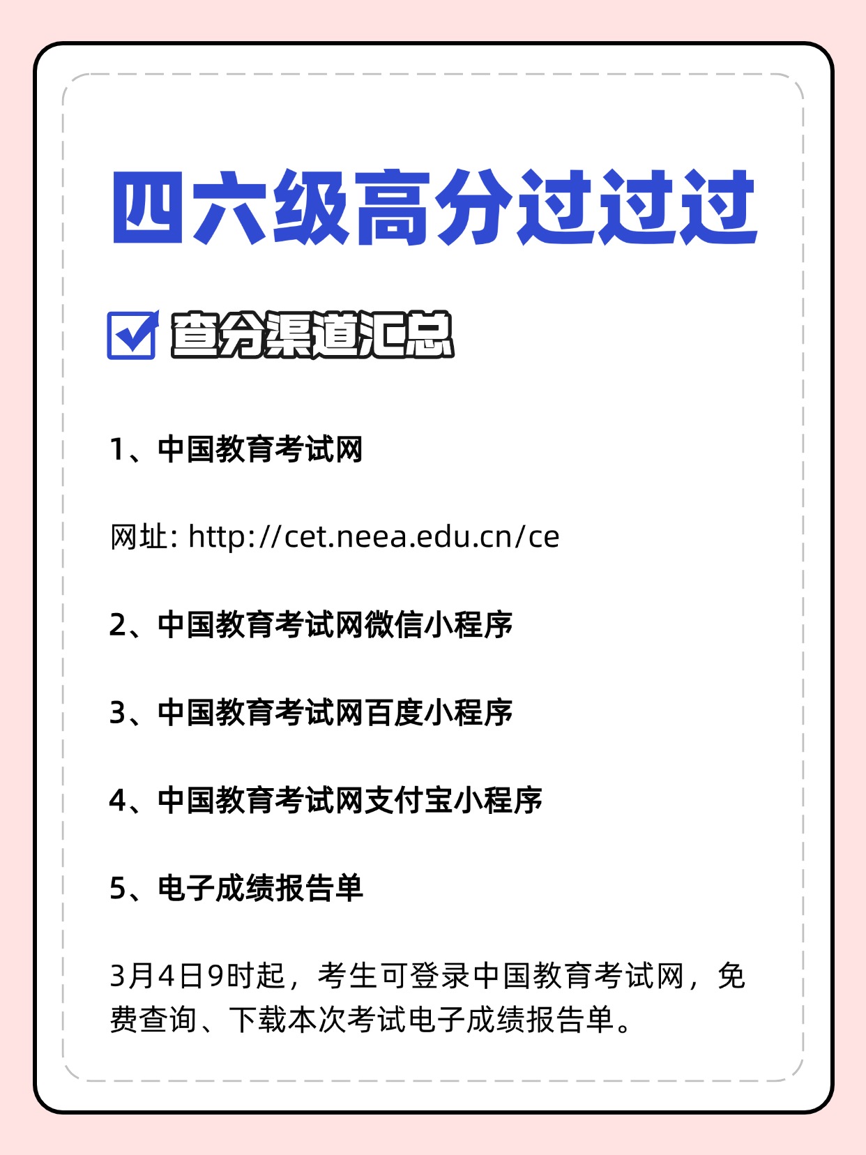四六级官方通知终于来了!2024年下半年四六级成绩将于2025年2月26日上午6:00 开放查询!附图是小优汇总的查分渠道,祝大家都能高分过过过!