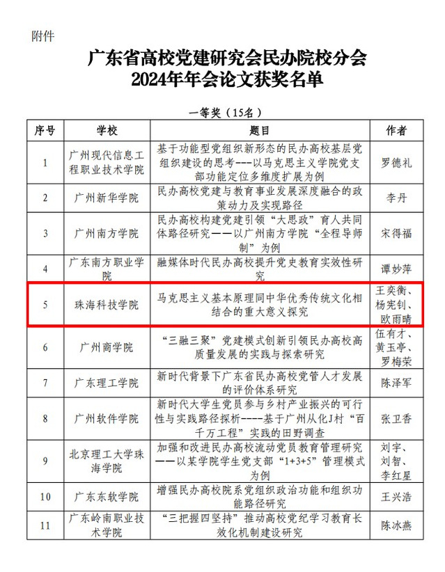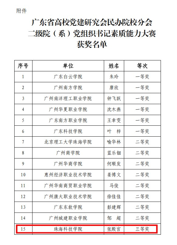 近日,广东省高校党建研究会民办院校分会公布2024年广东省民办高校二级院(系)党组织书记素质能力大赛和2024年党建论文评选活动获奖名单。