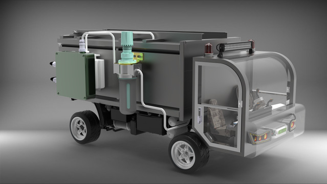 作品《智能垃圾回收、垃圾桶清洗消毒烘干多功能一体车》渲染图