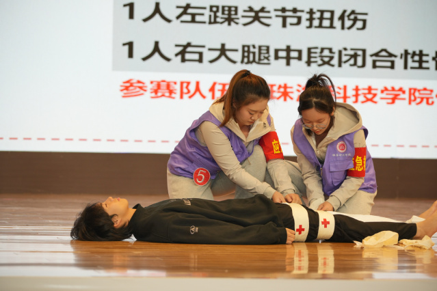 此次大赛特别邀请了澳门特别行政区红十字会的青年队伍加入,同时集结了全市9所知名高校的力量,涵盖中山大学珠海校区、北京理工大学(珠海)、暨南大学珠海校区、遵义医科大学珠海校区、北京师范大学-香港浸会大学联合国际学院、珠海科技学院、广东科学技术职业学院、珠海城市职业技术学院、珠海艺术职业学院,10支队伍同台交流,切磋技能。大赛采用主题演讲+场景演练模式进行比拼,十支参赛队伍根据抽签顺序及场景完成相应的应急救护技能操作。参赛队伍以饱满的精神状态,扎实的实操技能,展现了新时代青年学生昂扬的精神面貌和技能水平。我校派出的参赛队伍由健康学院5名学生组成,张颖老师带队。在场景演练环节中抽中的题目是运动伤害现场,需要对心搏骤停、右大腿中段闭合性骨折、左脚踝关节扭伤的三名伤员进行应急救护。比赛中,队员们默契配合,从现场秩序维护、人员分工安排、现场应急救护处置、患者情绪安抚等每一步都以高标准完成。在主题演讲环节,以“急救技能会于心,守护生命践于行”为题,现场以“什么是幸福?”为切入点,结合真实案例阐述了在现实生活中,只有不断演练和实践方可做到急救技能会于心,守护生命践于行。在张老师的悉心指导下,学生们以积极奋进、努力拼搏的精神和高质量的急救场景演练展示,在比赛中取得了二等奖的优异成绩。同时,我校在承办本次大赛中表现突出,获得了“优秀组织奖”。
