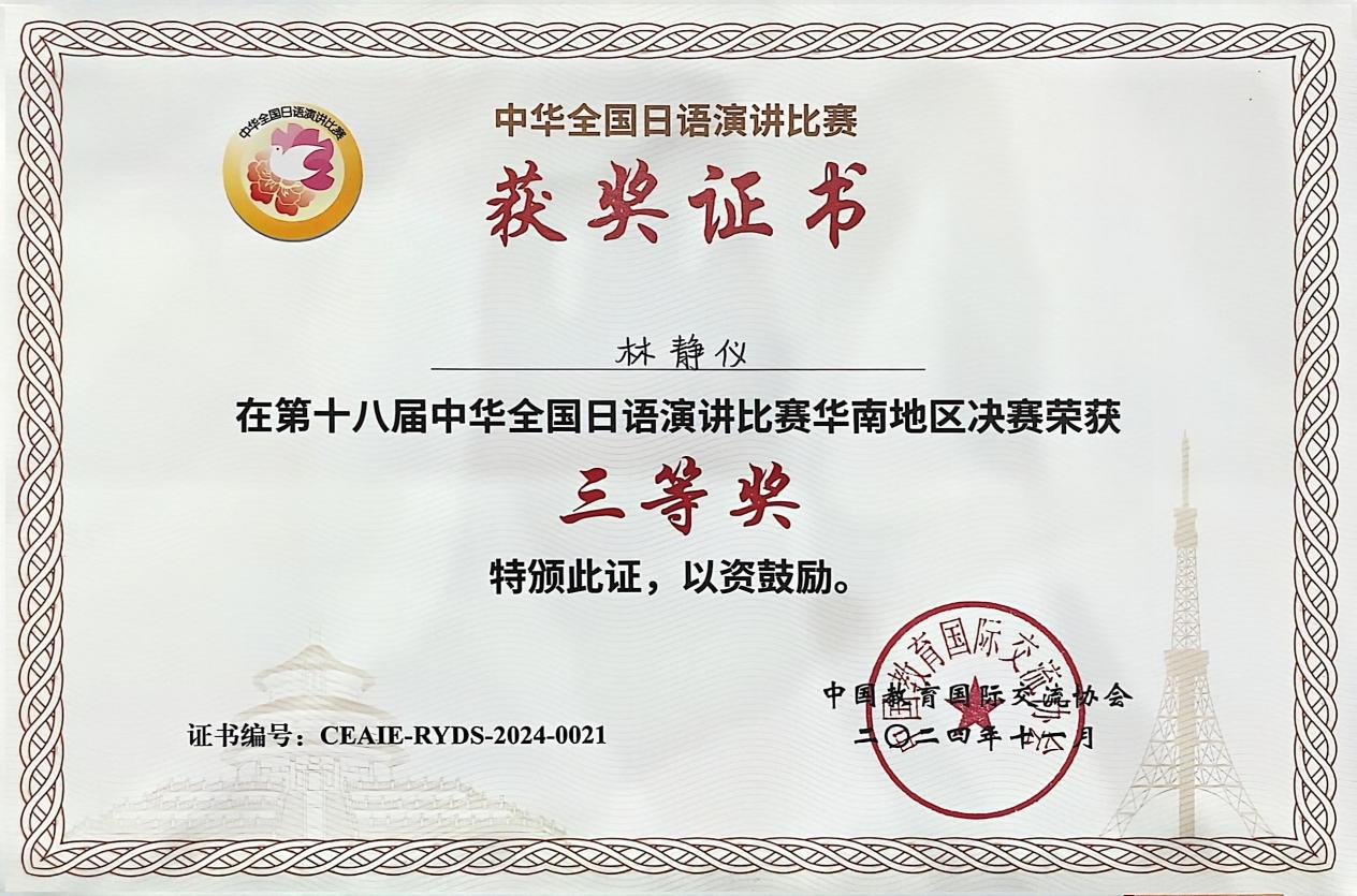 林静仪荣获第十八届中华全国日语演讲比赛华南地区决赛三等奖