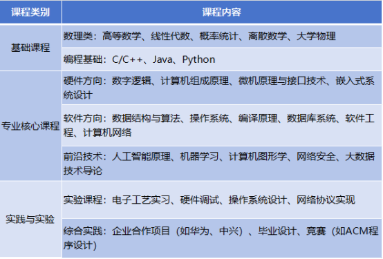 学习内容广泛涵盖计算机硬件与软件以及交叉应用领域。硬件方面侧重于物理设备与底层架构的实现,软件领域则聚焦于软件开发与系统优化。此外,还涵盖网络与信息安全、大数据分析、云计算、物联网和智能计算等交叉应用领域,旨在结合新兴技术解决实际问题。