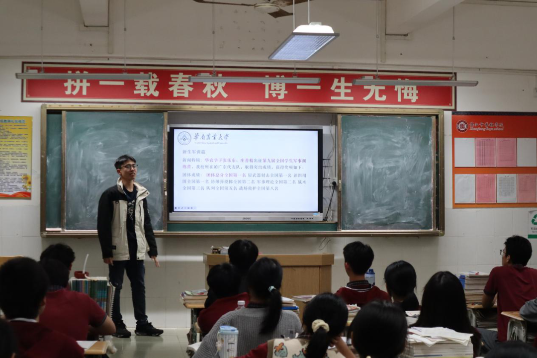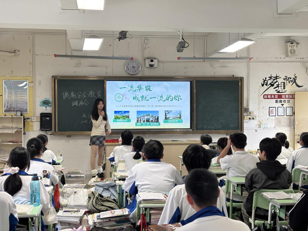 湛江四中寒招队伍分别于1月21日组织入班宣讲及2月7日开展校园摆摊宣传。1月21日,团队进入学校高三班级进行宣讲,为高考学子介绍了华南农业大学的历史底蕴、学科成果、招生专业、人才培养等。2月7日,华农寒招摊位前人头攒动,队员们积极宣讲华农的招生情况,并组建线上答疑群,进一步畅通考生咨询渠道。