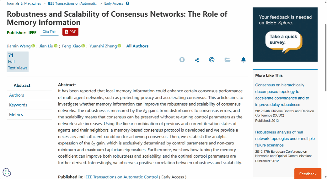 西电新闻网讯(通讯员刘健)多智能体网络化系统的一致性问题是分布式协同控制和智能系统研究中的核心课题之一,在机器人集群控制、无人机编队飞行、智能电网等领域具有广泛应用。在现实环境中,这些多智能体系统经常受到外部干扰的影响,且传统的一致性协议在面对网络规模变化时,通常需要重新调整控制参数,否则可能导致一致性无法保持或系统性能劣化,可扩展性较差。因此,如何增强多智能体系统一致性网络的鲁棒性与可扩展性,是学术界和工业界共同关注的难题。 针对这一科学问题,西安电子科技大学机电工程学院多智能体研究中心郑元世教授团队通过引入了智能体及邻居的历史状态,提出了一种基于记忆信息的一致性协议并建立了该协议下显式的一致域。通过严格的数学证明与数值验证,发现了记忆信息不仅可促进多种一致行为的自发涌现,还能显著增强多智能体系统一致性网络的鲁棒性与可扩展性。此外,研究团队通过建立了控制参数、记忆系数、网络拓扑特征和网络性能之间的定量和定性关系,得到了记忆信息增强网络性能的理论极限,发现了一致性网络的鲁棒性与可扩展性呈正相关。该研究率先揭示了记忆信息对多智能体系统一致性网络性能的增强机制,不仅为多智能体网络的优化提供了新的见解,也为实际应用中设计鲁棒性和可扩展性俱佳的控制算法提供了重要的理论依据。 研究成果得到了国家自然科学基金面上项目(62273267)的资助,以“Robustness and scalability of consensus networks: the role of memory information”为题,长文(full paper)形式在线发表在控制领域顶级期刊《IEEE Transactions on Automatic Control》上,西安电子科技大学为论文第一单位,机电工程学院王嘉敏博士为第一作者,郑元世教授为通讯作者。 据悉,《IEEE Transactions on Automatic Control》是IEEE控制系统学会的旗舰汇刊,被公认为国际控制与自动化领域的顶级期刊,是衡量各高校控制领域学术水准的标志性期刊,其长文发表需要重要理论或应用创新。 近年来,该研究团队一直致力于探索集群控制及性能优化的新范式,深入挖掘智能体动力学、通信网络、通信协议和网络性能之间的本质联系,逐步建立较为完善的理论分析框架,并最终取得这项创新性研究成果,为群体智能的涌现机理进一步提供了理论支撑。团队前期相关研究成果已于2024年发表在控制领域顶级期刊《IEEE Transactions on Automatic Control》(长文)和《Automatica》,机电工程学院王嘉敏博士均为论文的第一作者。 责任编辑:冯毓璇