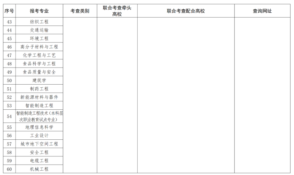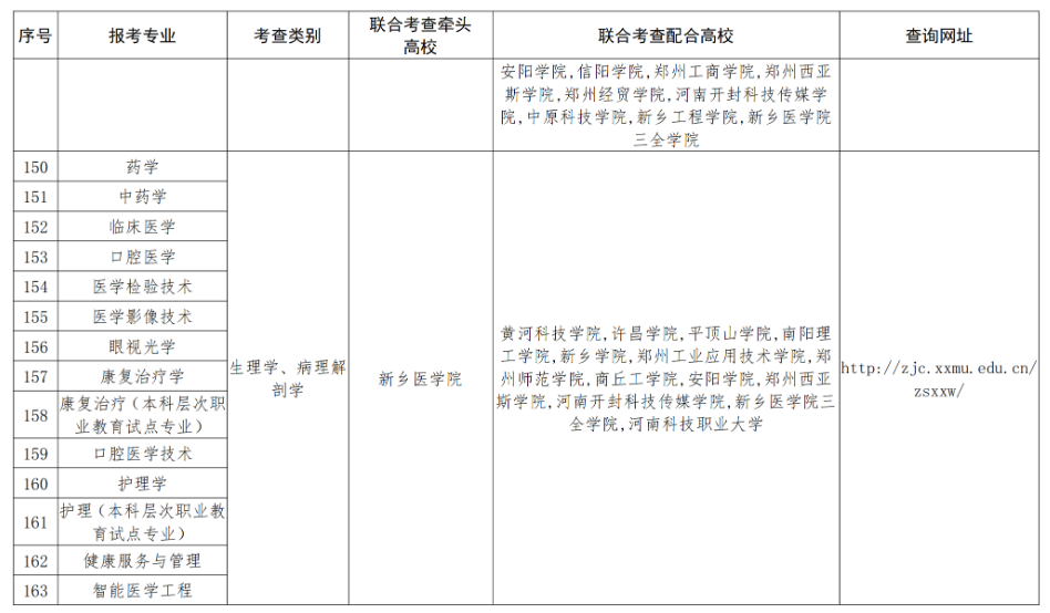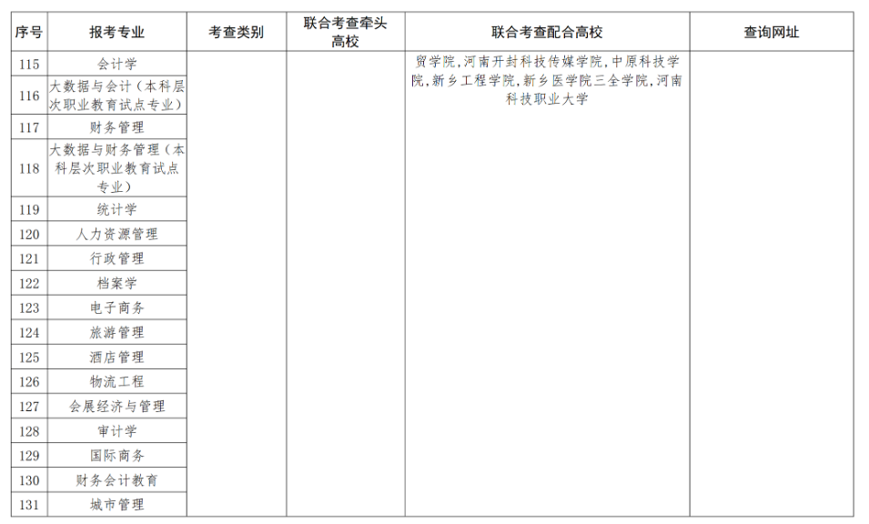 二、合理制定联考方案。各联合考查组要根据本专业大类培养目标和对考生能力的要求,结合报考情况,合理制定联合考查方案,明确高校考查时间、考查地点、考查方式、录取规则、联系电话、网址等事项。各牵头高校要于3月6日前将联合考查方案上传至“河南省普通高校招生章程核定系统”(网址:http://gxzszc.jyt.henan.gov.cn)进行核定,3月15日前向社会公布。考生可登录附表中的相关网址进行查询。